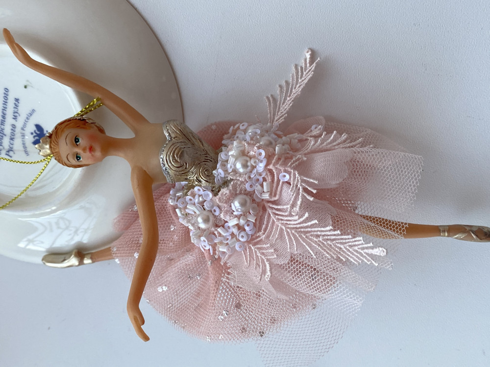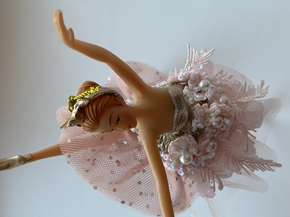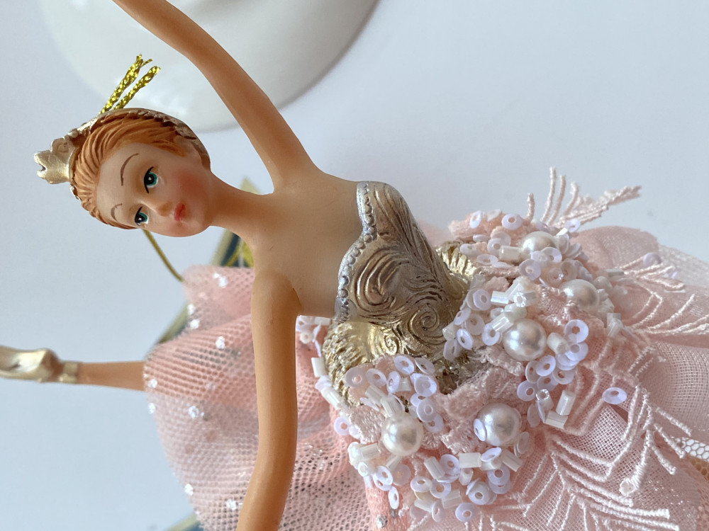 Заказывала двух разных балерин. Благодаря тому, что у этой балерины юбка выполнена из сетки, она лучше держит форму, но все же не так, как на картинке. Лицо, руки и плечи выполнены не очень аккуратно. На фото с телефона выглядит ярче и наряднее. Чего-то мне в этих балеринах не хватило.