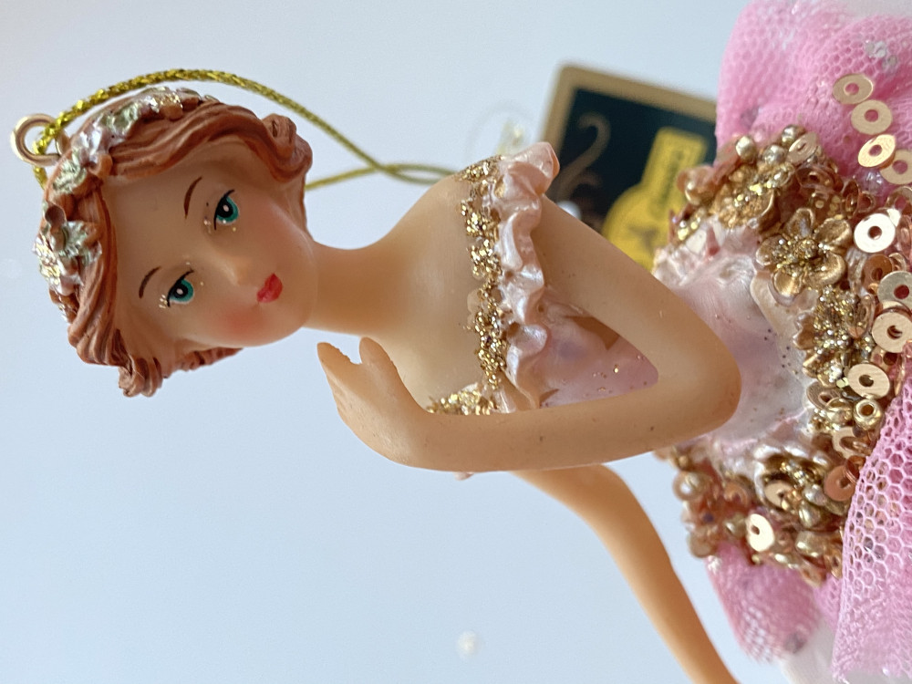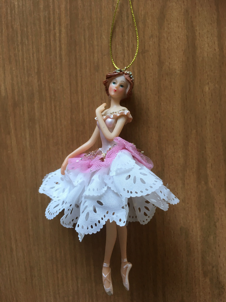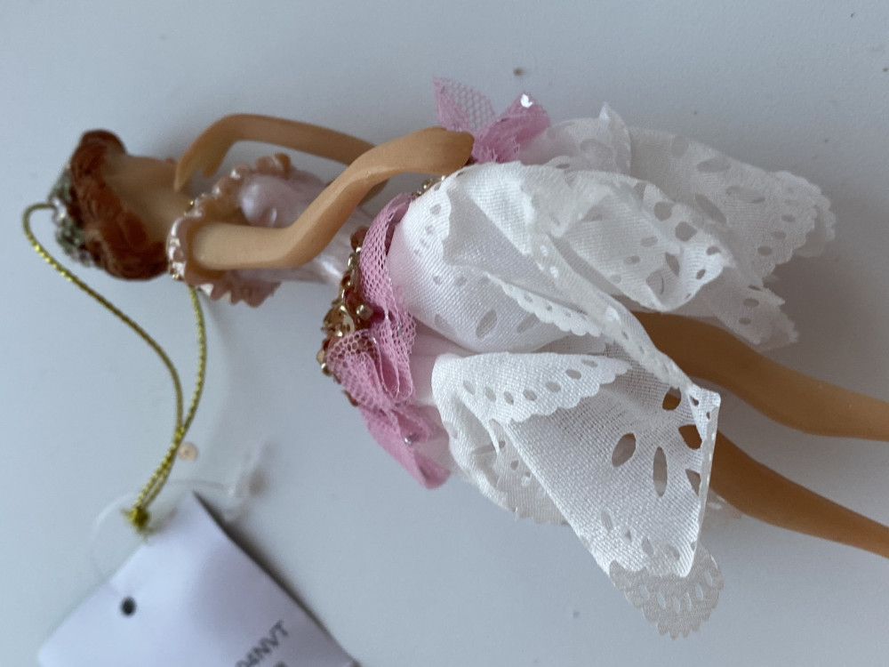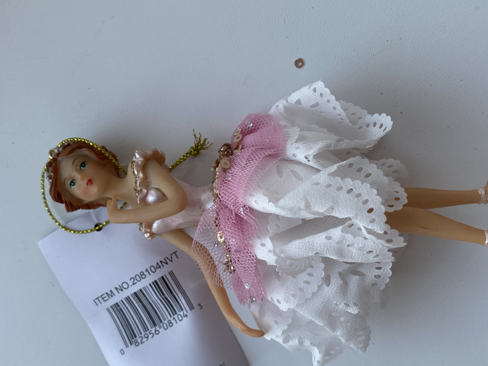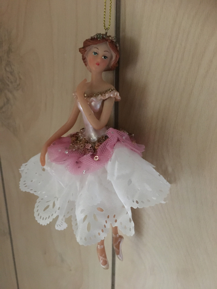 Прелестная новогодняя игрушка! Очень аккуратно выполнена - личико, ручки-ножки, поза грациозная - одним словом, придраться не к чему. Юбочка-пачка только в дороге примялась, но тут поделюсь лайфхаком: слегка смочите ткань юбочки и поставьте фигурку в пустой бокал до высыхания 😀