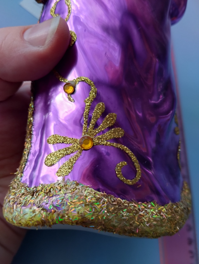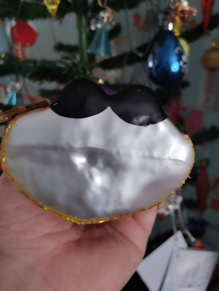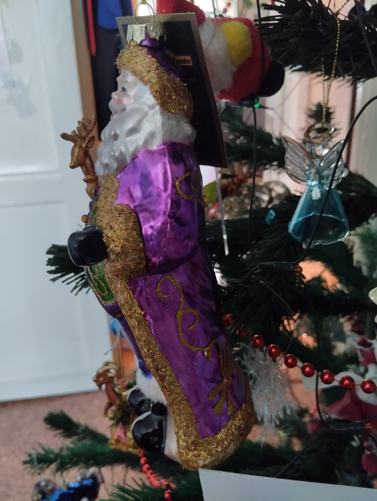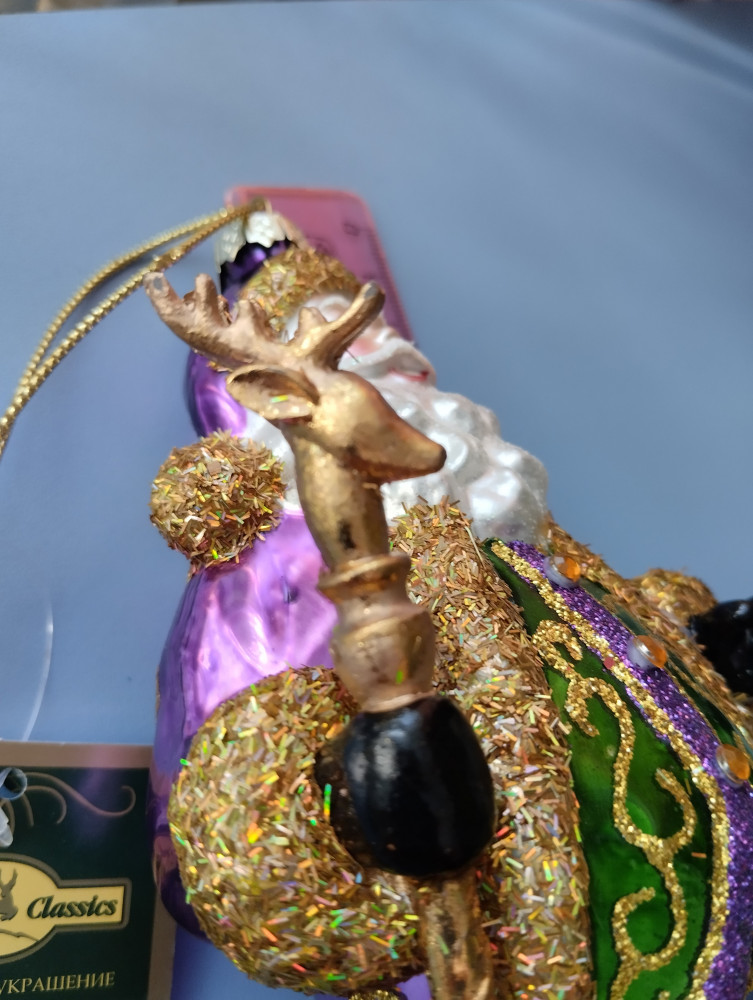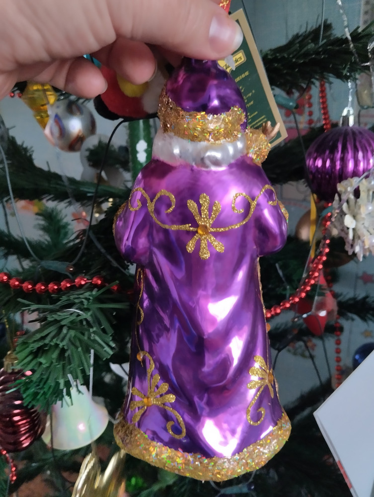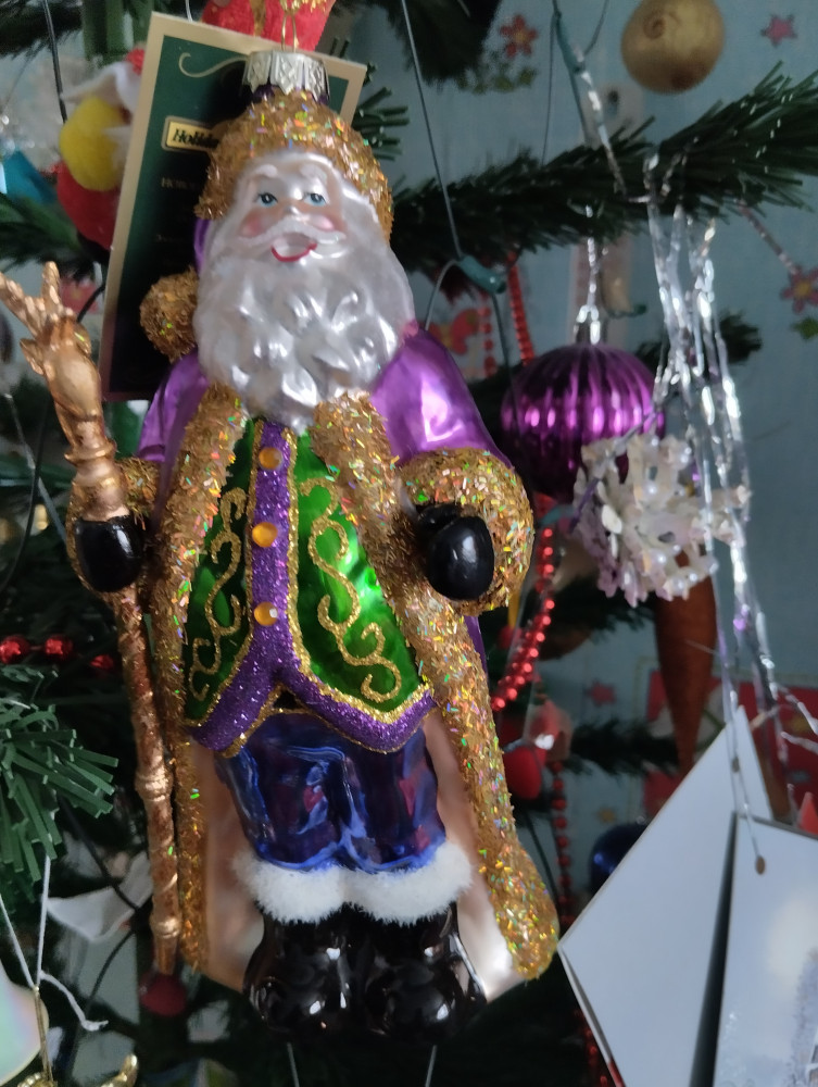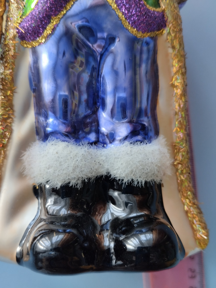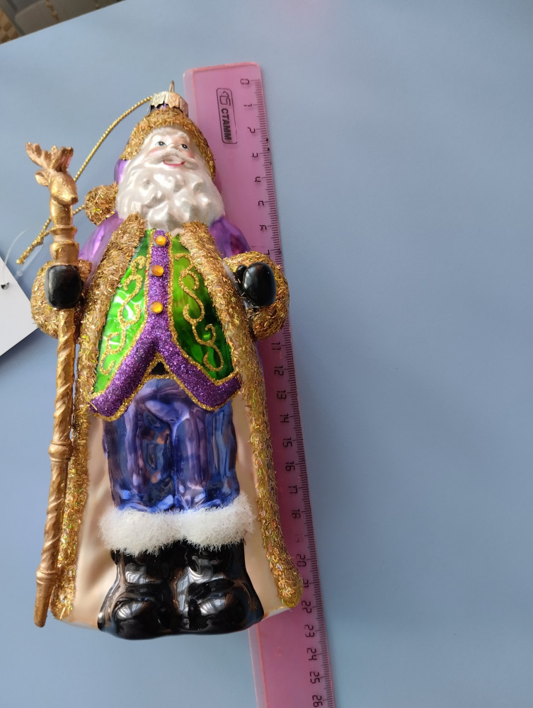 Первым впечатлением было - ого, какой большой! Хотя я видела, что в описании стояло 20 см, но не ожидала, что это окажется правдой. Для сравнения рядом игрушка-шарик 6 см. Большой, красивый, лицо хорошо прокрашено. Немного не соответствует цвет штанов - не такой насыщенный, полосы, словно выцвел синий пигмент. Опушка жёлтая по контуру шубы кое-где вытерлась сильно, на черных штанах белая опушка немного потерлась. Но в общем впечатление очень хорошее, за 6 тысяч тенге (брала со скидкой) у нас в городе такую большую фигурку не купить. Рекомендую, вам понравится.