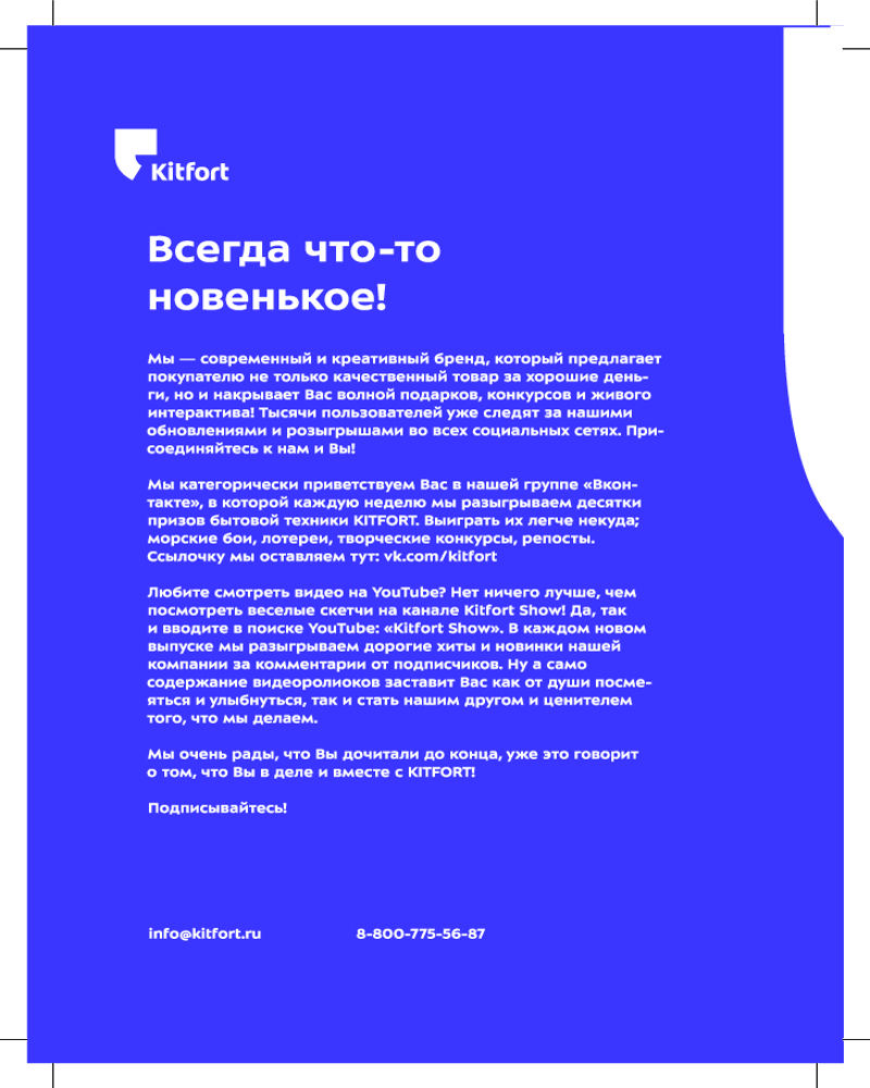 Российский бренд Kitfort занимает лидирующие позиции на рынке бытовой техники для кухни и дома. Основанная в 2011 году в городе Санкт-Петербурге, компания Kitfort стремится предоставить своим клиентам передовые технологии и инновационные решения для повседневных задач и создания комфортного пространства в доме.