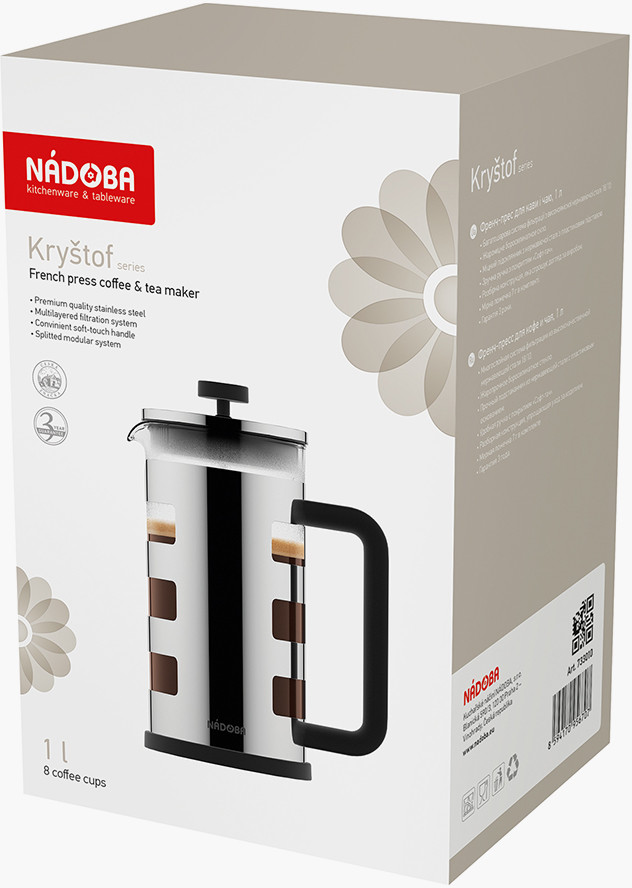 Френч-прессы серии «Krystof» имеют колбу, выполненную из жаропрочного боросиликатного стекла. Прочный подстаканник из нержавеющей стали с пластиковой подставкой обеспечивает дополнительную термоизоляцию и предохраняет колбу от повреждений. Многослойная система фильтрации френч-прессов выполнена из высококачественной нержавеющей стали 18/10. Удобная ручка с покрытием «Софт-тач» не нагревается и не выскальзывает из рук. Разборная конструкция изделий и системы фильтрации облегчают легкий и качественный уход. В комплекте предусмотрена мерная ложка (7 г) точной дозировки продуктов.
