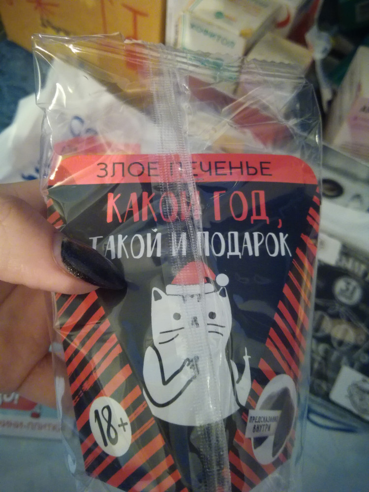 Покупали в дополнение к основным подаркам на НГ. На картинке пожелания внутри печеньки с юмором, нам же попались почти все добрые и хорошие пожелания, без юмора. Сама печенька вкусная. В упаковке 1 печенька с предсказанием небольшого размера.