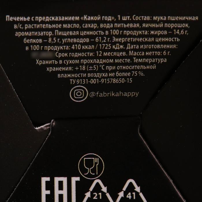 Фабрика счастья Печенье с предсказанием «Какой год»В данный момент этот товар отсутствует в продаже. Возможно, у нас найдется аналогичный или похожий товар здесь. Серия: Новый год В преддверии Нового года все начинают лихорадочно придумывать какие-нибудь милые сюрпризы для родных и друзей. Однако, как говорится, все гениальное — просто. Отличным вариантом станет новогоднее печенье с предсказаниями. Это печенье с сюрпризом внутри пришло к нам из Китая. За эти годы оно стало идеальным развлечением на вечеринках и банкетах. Оно удовлетворит потребность гостей, желающих отведать десерта и тех, кто хочет немного развлечься! |