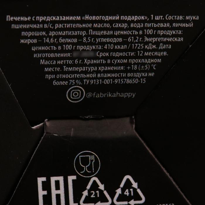 Фабрика счастья Печенье с предсказанием «Новогодний подарок»В данный момент этот товар отсутствует в продаже. Возможно, у нас найдется аналогичный или похожий товар здесь. Серия: С НГ, короче В преддверии Нового года все начинают лихорадочно придумывать какие-нибудь милые сюрпризы для родных и друзей. Однако, как говорится, все гениальное — просто. Отличным вариантом станет новогоднее печенье с предсказаниями. Это печенье с сюрпризом внутри пришло к нам из Китая. За эти годы оно стало идеальным развлечением на вечеринках и банкетах. Оно удовлетворит потребность гостей, желающих отведать десерта и тех, кто хочет немного развлечься! |