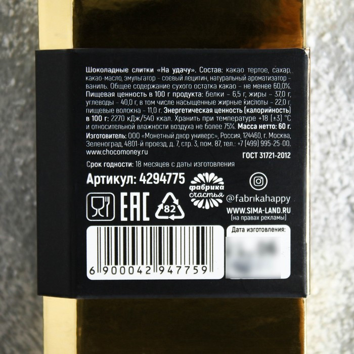 Фабрика счастья Слитки шоколадные «На удачу»В данный момент этот товар отсутствует в продаже. Возможно, у нас найдется аналогичный или похожий товар здесь. Серия: Золотой шик Шоколадные поздравления для Новогоднего настроения! Подарок наполненный Новогодним волшебством и вкусным шоколадом! |
