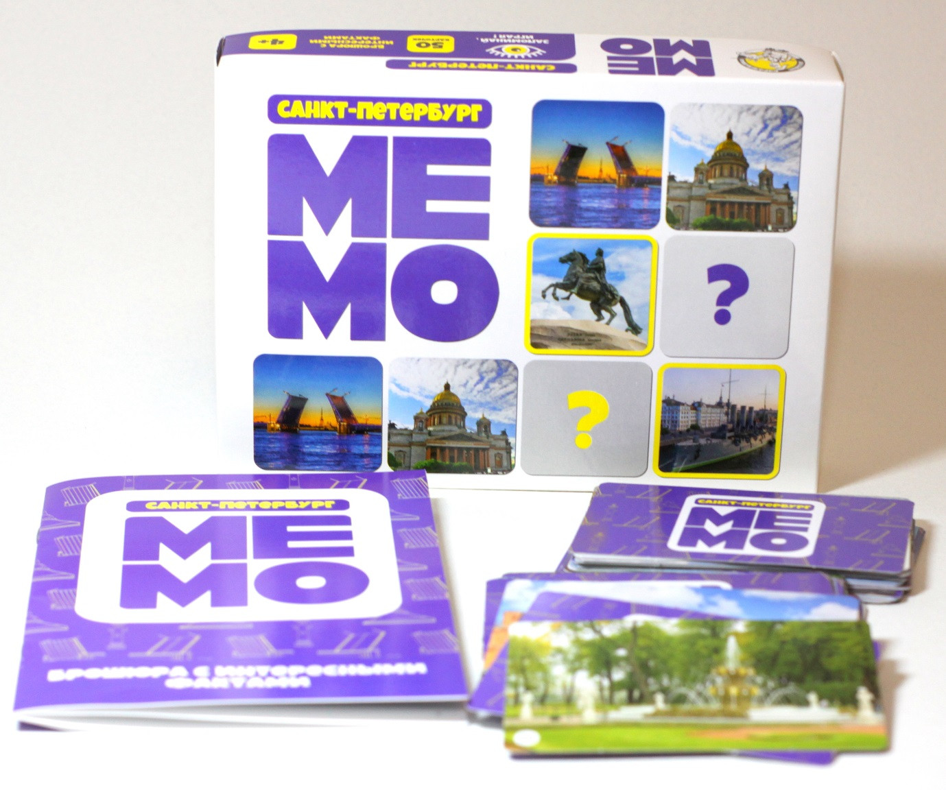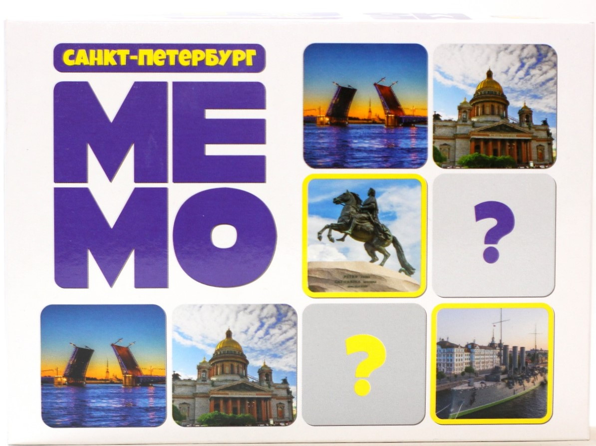 Мемо — это игра для тренировки зрительной памяти. В состав игры входит 50 парных карточек, то есть всего 25 пар карточек. На карточках изображены известные места и памятники Санкт-Петербурга. А еще — буклет с описанием всех исторических мест. Такая игра прекрасно расширит кругозор!