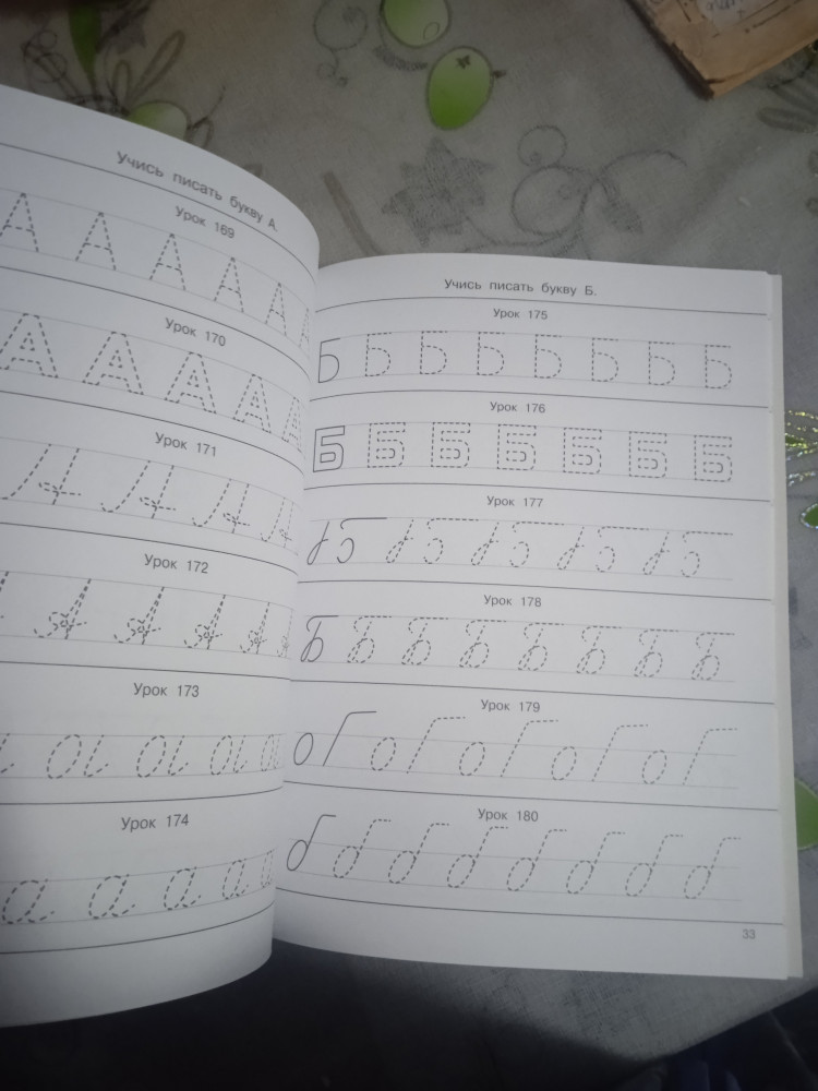 начинается закорючками потом дальше больше и идут буквы прописные и печатные