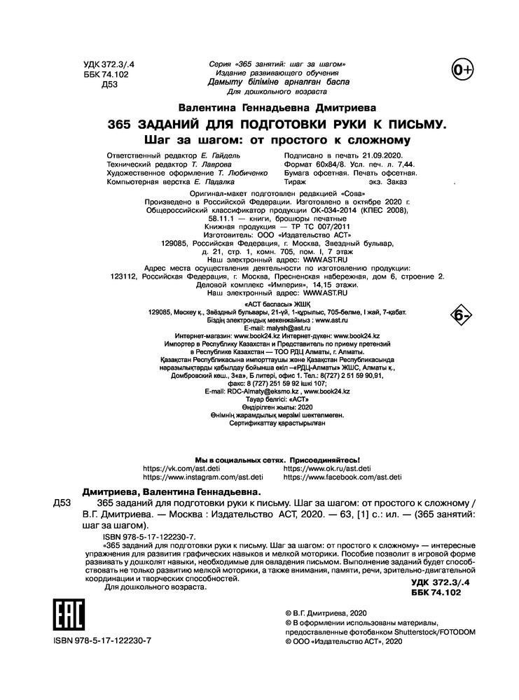 💳 Оплатить за товар можно при получении 🇰🇿 Есть бесплатная доставка по Казахстану от 1 дня 🎁 Копите бонусы с каждой покупки Серия: 365 занятий: шаг за шагом «365 заданий для подготовки руки к письму. Шаг за шагом от простого к сложному» — интересные упражнения для развития графических навыков и мелкой моторики. Пособие позволит в игровой форме развивать у дошколят навыки, необходимые для овладения письмом. Выполнение заданий будет способствовать не только развитию мелкой моторики, а также внимания, памяти, речи, зрительно-двигательной координации и творческих способностей. |