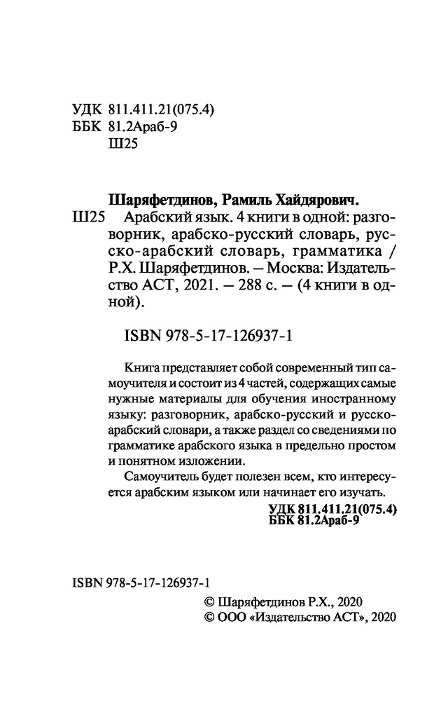 💳 Оплатить за товар можно при получении 🇰🇿 Есть бесплатная доставка по Казахстану 🎁 Копите бонусы с каждой покупки Серия: 4 книги в одной Книга представляет собой современный тип самоучителя и состоит из 4 частей, содержащих самые нужные материалы для обучения иностранному языку: разговорник, арабско-русский и русско-арабский словари, а также раздел со сведениями по грамматике арабского языка в предельно простом и понятном изложении. |