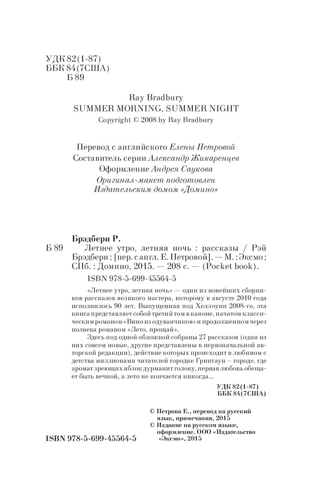 Аккуратная книга с красивой обложкой и неплохим шрифтом внутри. "Летнее утро, летняя ночь" является продолжением романов "Вино из одуванчиков" и "Лето прощай". Новые встречи с жителями Гринтауна, в том числе и с семейством Сполдингов, интересные сюжеты, философские темы, социум, детектив, мистика и неповторимая атмосфера произведений Рэя Брэдбери. Меня этот набор не оставляет равнодушной. Книга состоит из рассказов разных лет, однако все они написаны и изложены на очень высоком интеллектуальном уровне и в неповторимой манере писателя.