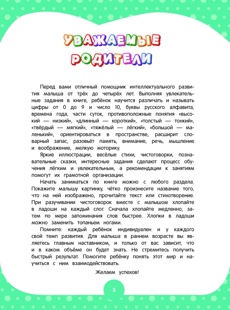 💳 Оплатить за товар можно при получении 🇰🇿 Есть бесплатная доставка по Казахстану от 1 дня 🎁 Копите бонусы с каждой покупки Серия: Годовой курс за полгода (обложка) Основная цель пособия — комплексное развитие ребёнка 3-4 лет. Тематика включённых в книгу разделов соответствует ФГОС. Вместе с книгой малыш быстро выучит цифры и научится считать, узнает о гласных и согласных звуках, расширит словарный запас, познакомится с временами года и частями суток, а также разовьет память, внимание, речь, мышление, графические навыки. А сказки на ночь помогут родителям уложить малыша в постель. Кроме того, в книге имеются рекомендации опытных педагогов и психологов, которые подскажут, как объяснять малышу новый материал, на что обратить внимание и как организовать занятия. |