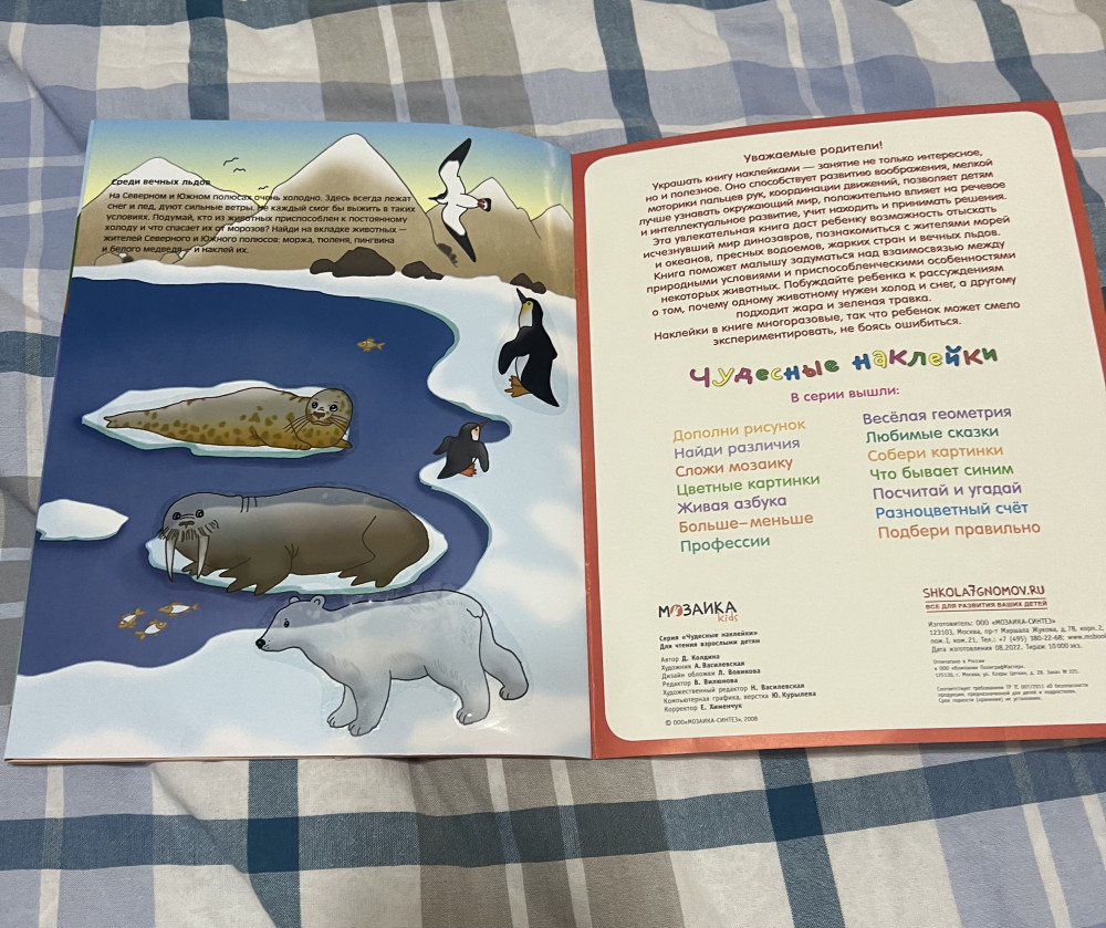 💳 Оплатить за товар можно при получении 🇰🇿 Есть бесплатная доставка по Казахстану от 1 дня 🎁 Копите бонусы с каждой покупки Серия: Чудесные наклейки Украшать книгу наклейками — занятие не только интересное, но и полезное. Оно способствует развитию воображения, мелкой моторики пальцев рук, координации движений, позволяет детям лучше узнавать окружающий мир, положительно влияет на речевое и интеллектуальное развитие, учит находить и принимать решения. |