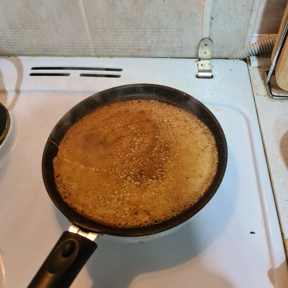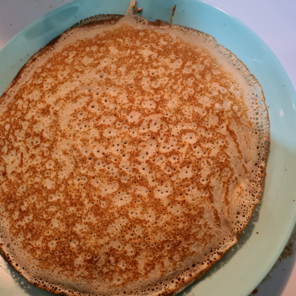 была опасность , что диаметр маловат, но блины в самый раз. пекла на сухой сковородке, масло добавила только в тесто. даже первый блин хорошо отошел. получились хорошие пузырчатые блины