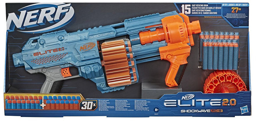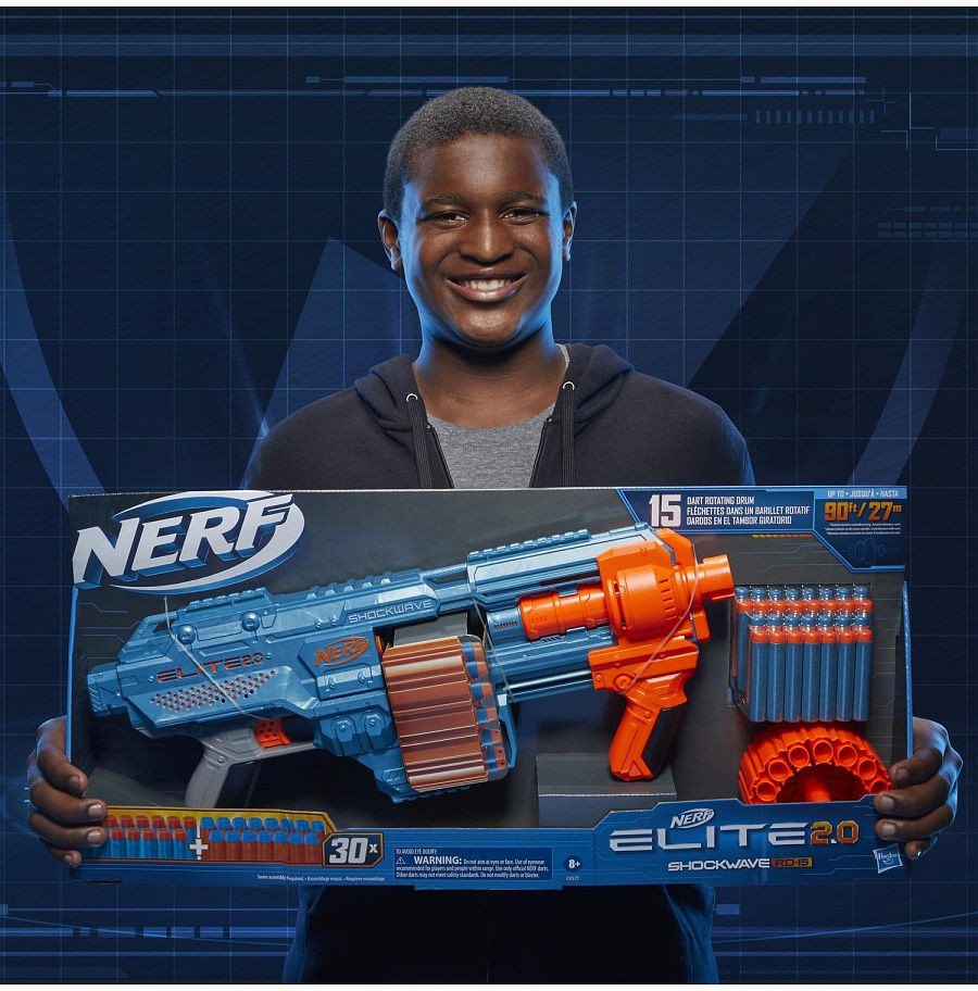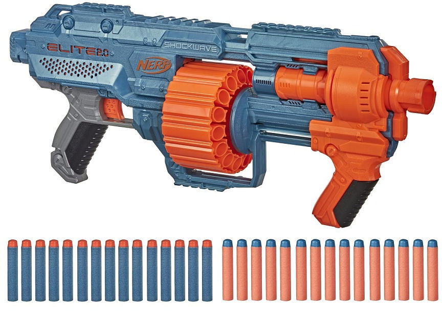 Вооружитесь бластером «Nerf Elite 2.0 Shockwave» и подготовьтесь к бою: бластер оснащен встроенными элементами индивидуальной настройки, которые позволяют получать преимущество в соревнованиях. Этот помповый бластер с вращающимся барабаном на 15 стрел может обрушить на соперников огневую мощь! Создайте арсенал бластеров «Nerf Elite 2.0», чтобы оптимизировать стратегию игры!