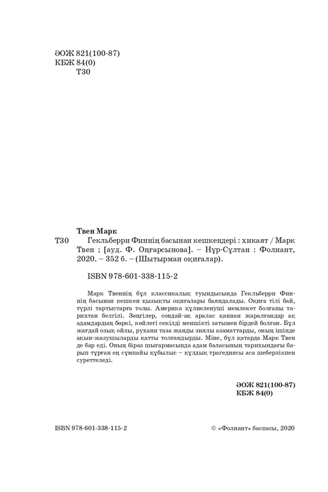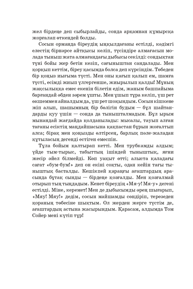 Специально купил для освоения казахского языка. После прочтения на казахском языке "Том Сойердің басынан кешкендері" самый раз вновь окунуться в мир приключений, но у же с Гекльбери Финном. Яркая обложка так и манит начать читать.