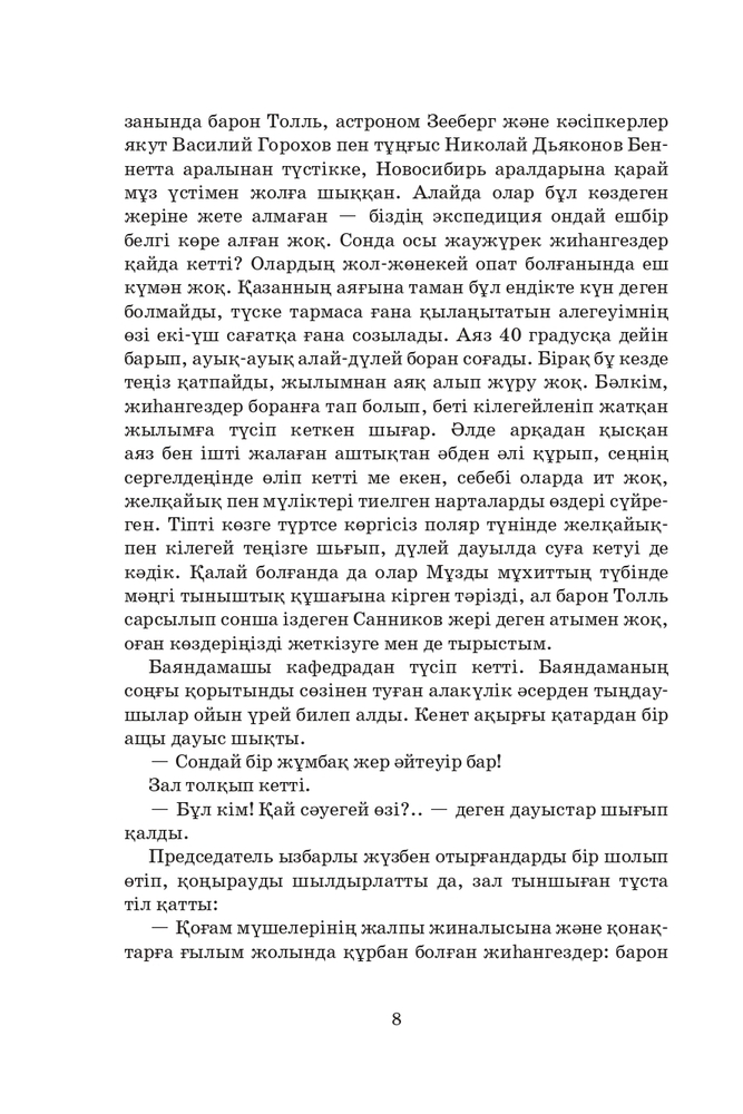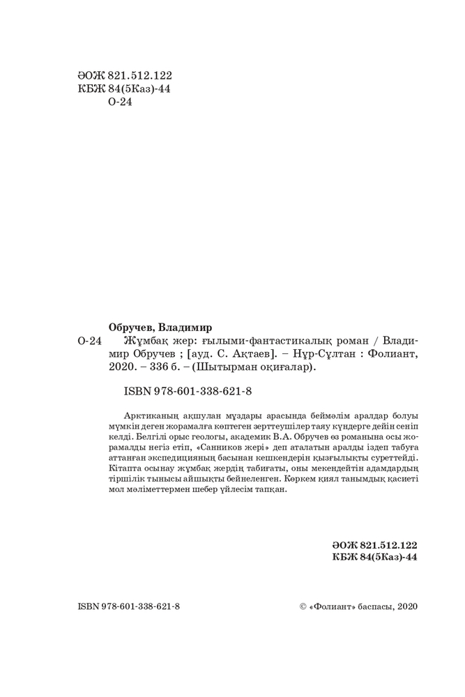 💳 Оплатить за товар можно при получении 🇰🇿 Есть бесплатная доставка по Казахстану от 1 дня 🎁 Копите бонусы с каждой покупки Арктиканың ақшулан мұздары арасында беймәлім аралдар болуы мүмкін деген жорамалға көптеген зерттеушілер таяу күндерге дейін сеніп келді. Белгілі орыс геологы, академик В. А. Обручев өз романына осы жорамалды негіз етіп, «Санников жері» деп аталатын аралды іздеп табуға аттанған экспедицияның басынан кешкендерін қызғылықты суреттейді. Кітапта осынау жұмбақ жердің табиғаты, оны мекендейтін адамдардың тіршілік тынысы айшықты бейнеленген. Көркем қиял танымдық қасиеті мол мәліметтермен шебер үйлесім тапқан. |