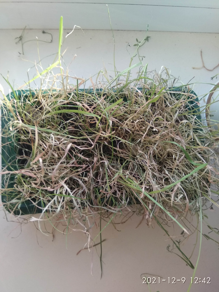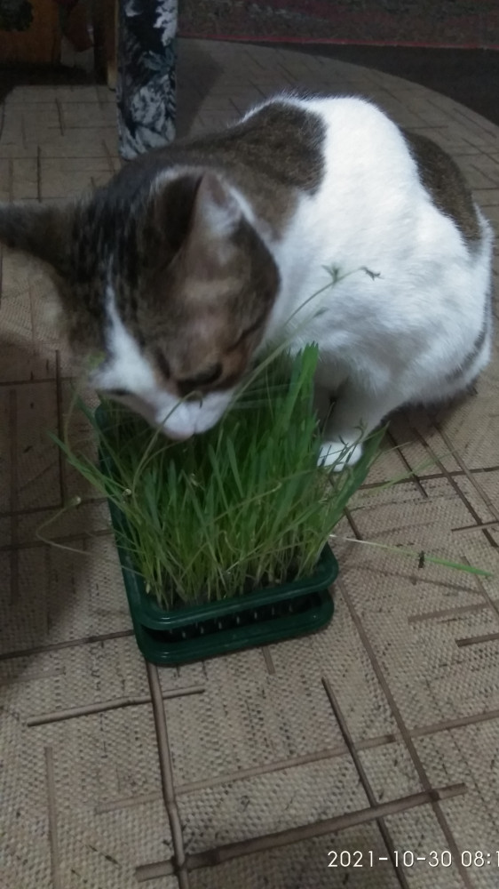 Дополню отзыв, что семян много и лучше поделить из на два или три раза, это если для кота. Так как всходы получаются густыми и кот с таким объемом травы не справляется, хотя ест каждый день. Трава тем временем зацветает и засыхает, так как нет совсем почвы. Может кролик и всё съест))). В следующий раз буду делить семена на несколько частей и сеять в горшок с землёй. На мой взгляд это практичнее . На фото видно, что произошло через месяц , трава не съедена, а засохла.