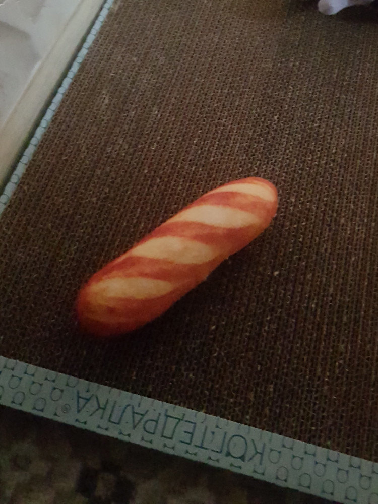 плотная ткань игрушки. яркий, красивый хлебушек, который пахнет валерьянкой.
