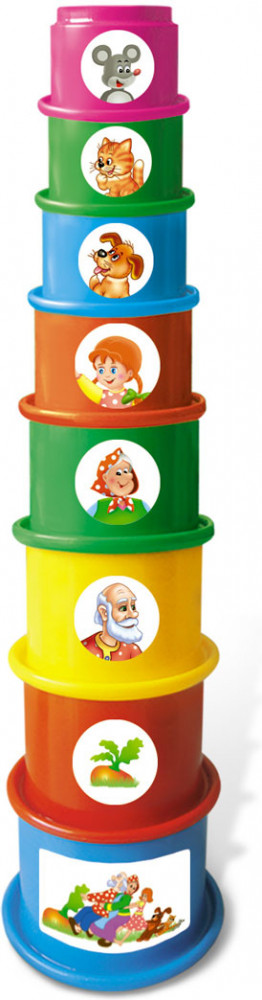 Пирамидка «Репка» собирается из стаканчиков разного размера. Только соблюдая четкую последовательность от большего стаканчика к меньшему у малыша получится башенка. Чтобы ребенку было легче разобраться мы разместили на стаканчиках изображения героев из сказок.