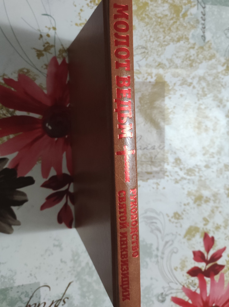 В начале книги,на 60 страниц написана интересная статья о влияние церкви и молоте ведьм в 12-18х. веках Фото товара,это суперобложка,сама книга коричневая под кожу,красным переливающимся напечатан герб инквизии,сбоку книги надписи молот ведьм/руководство святой инквизиции и крест