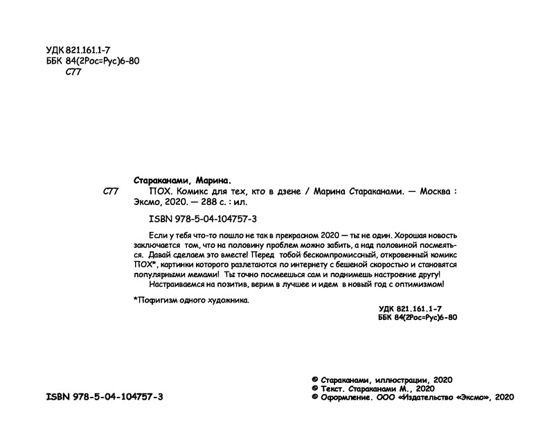 Серия: Комиксы со смыслом Если у тебя что-то пошло не так в прекрасном 2020 — ты не один. Хорошая новость заключается том, что на половину проблем можно забить, а над половиной посмеяться. Давай сделаем это вместе! Перед тобой бескомпромиссный, откровенный комикс ПОХ*, картинки которого разлетаются по интернету с бешеной скоростью и становятся популярными мемами! Ты точно посмеешься сам и поднимешь настроение другу! |