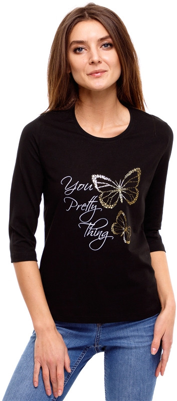 Симпатичный лонгслив выполнен из легкого хлопкового полотна с лайкрой. Изделие с рукавами 3/4, округлым вырезом горловины, украшено дизайнерским принтом. Актуальный дизайн делает его незаменимым предметом женского гардероба!