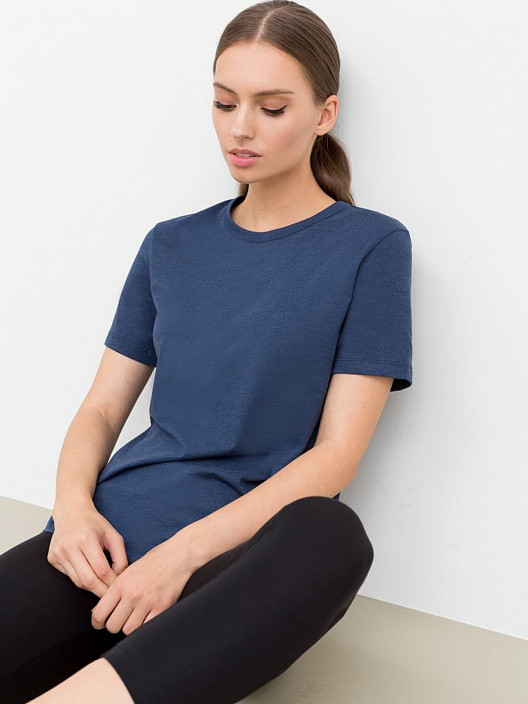 Повседневная футболка свободного кроя в синем меланжевом цвете. Футболка выполнена из 100% хлопка. Модель имеет круглую горловину. Материя «кулирное полотно» приятно прилегает к телу и отлично пропускает воздух, позволяя коже дышать. Футболку можно сочетать с джинсами, трикотажными брюками или леггинсами.