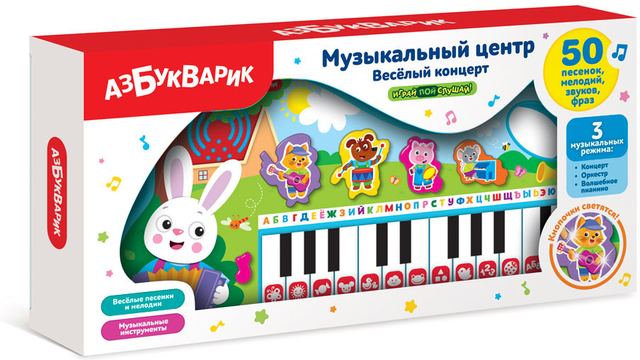Азбукварик Пианино «Веселый концерт»В данный момент этот товар отсутствует в продаже. Возможно, у нас найдется аналогичный или похожий товар здесь. Серия: Музыкальный центр Устрой концерт с весёлыми зверятами-музыкантами! Выбери один из трех режимов: «Концерт», «Оркестр» или «Волшебное пианино». Играй и веселись! Нажимай на кнопочки — знакомься с музыкальными инструментами, слушай более 20 песенок и мелодий («Лето», «Стало солнышко теплей», «Друзья», «Прятки», «Весёлые противоположности», «Дождик», «Танец зверят», «Формы разные на свете», «Ладушки», «Начинаем счёт подряд», «Божья коровка», «Песенка про алфавит», «Пляшут весело детишки», «Бум-Бум», «Зарядка», «Барбарики (Что такое доброта?)» и др.). Играй на клавишах пианино — запоминай ноты и развивай музыкальный слух. А в режиме «Волшебное пианино» каждый ребенок сможет сам сыграть 5 известных мелодий («Собачий вальс», «Как у наших у ворот», «Каравай», «Два весёлых гуся», «Серенький козлик»). |