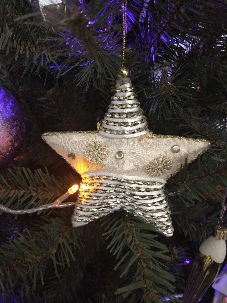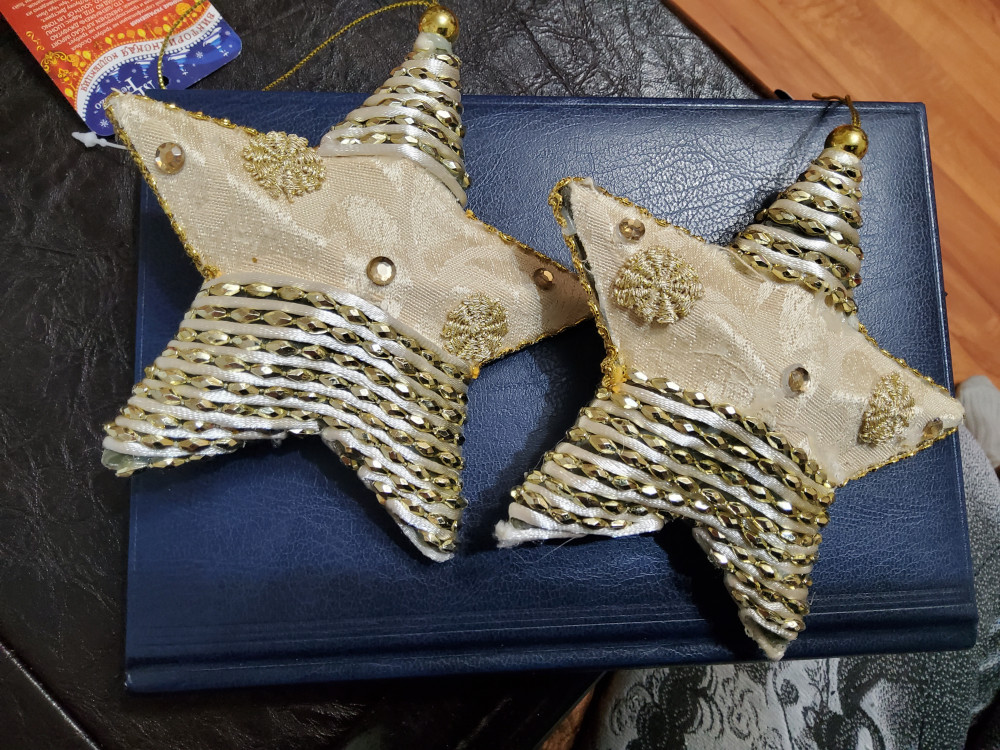 Мне снова удалось купить эти чудесные звезды. Я очень рада. Мне очень нравятся вещи, где используется ручной труд. Звезда довольна большая. Около 12 см. Очень красивая. Лёгкая. Стильная. Бусины, ленты, стразы. Красота! Я очень довольна, благодарю вас от всей души!