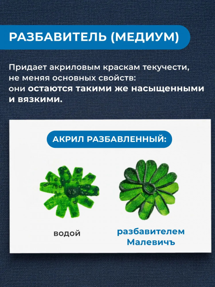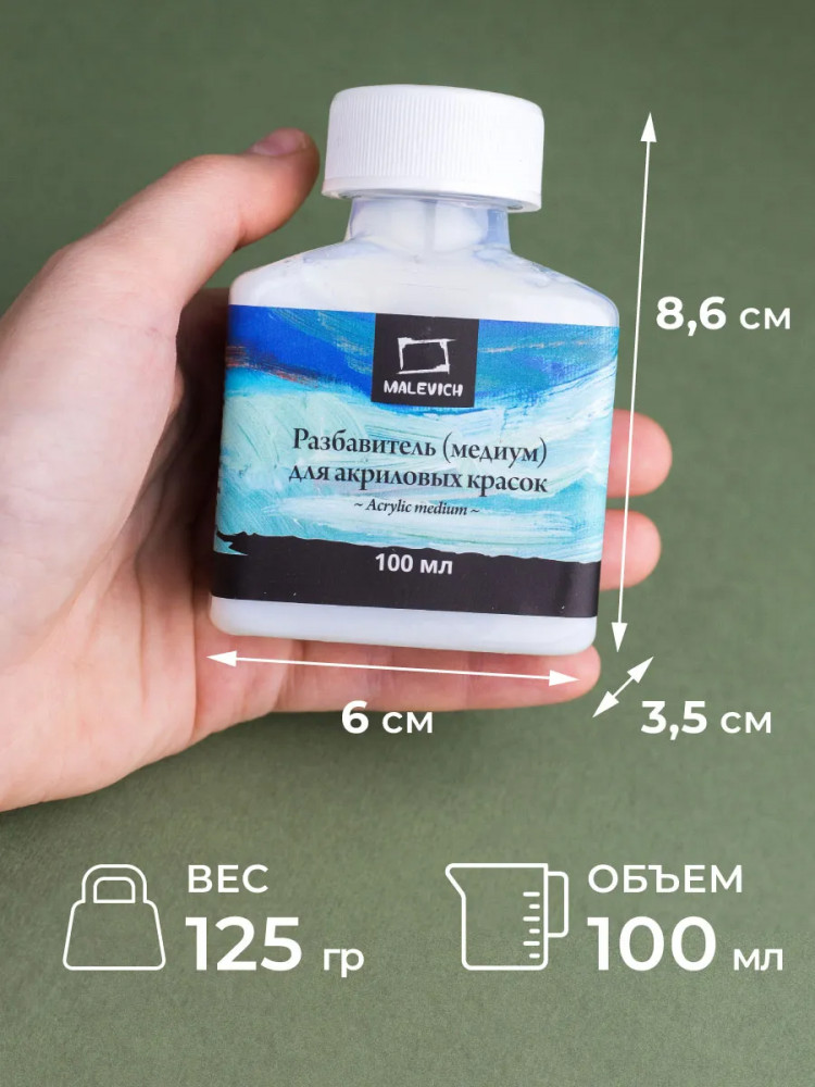 МалевичЪ Разбавитель для акриловых красоккачество растворяет задаче справляется сгущает краски быстро сохнет В данный момент этот товар отсутствует в продаже. Возможно, у нас найдется аналогичный или похожий товар здесь. Разбавитель (медиум) для акриловых красок Малевичъ, 100 мл. Разбавитель для акриловых красок и текстурной пасты. Используется для усиления прозрачности и уменьшения вязкости текстуры. Обеспечивает плавность перехода оттенков и сохраняет их насыщенность. Придает легкий блеск. Может использваться в качестве проклейки перед нанесением акриловой краски на ткань. |
