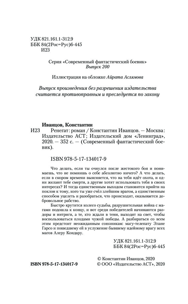 РенегатВ данный момент этот товар отсутствует в продаже. Возможно, у нас найдется аналогичный или похожий товар здесь. Серия: Современный фантастический боевик Что делать, если ты очнулся после жестокого боя и понимаешь, что не помнишь о себе абсолютно ничего? А что делать, если в скором времени выясняется, что на тебя идёт охота, и одни желают тебе смерти, а другие хотят использовать тебя в своих интересах? И тогда единственным выходом становится прийти на поклон к тому, кого ты уже счёл злейшим врагом, а единственным способом уцелеть и разобраться, что происходит, оказывается добровольное рабство. |