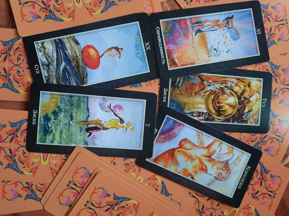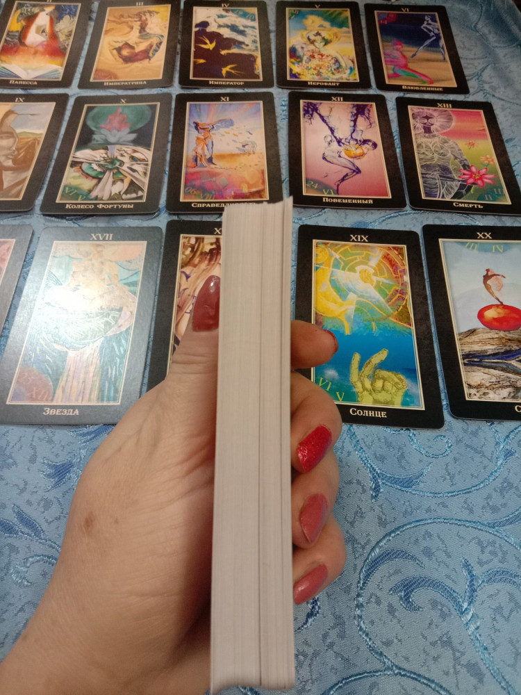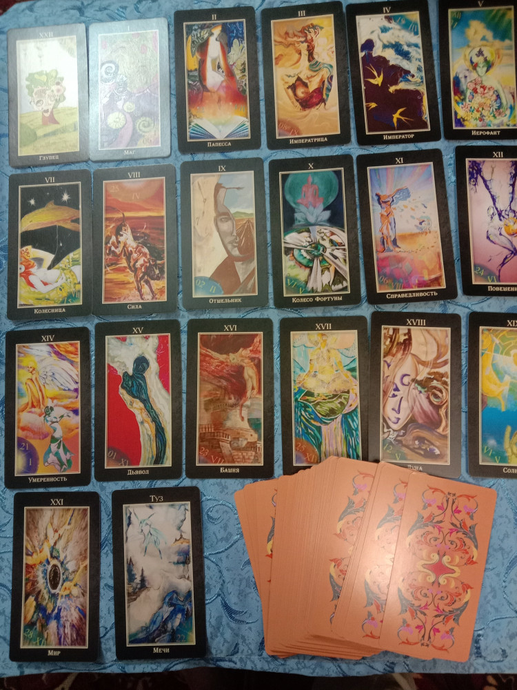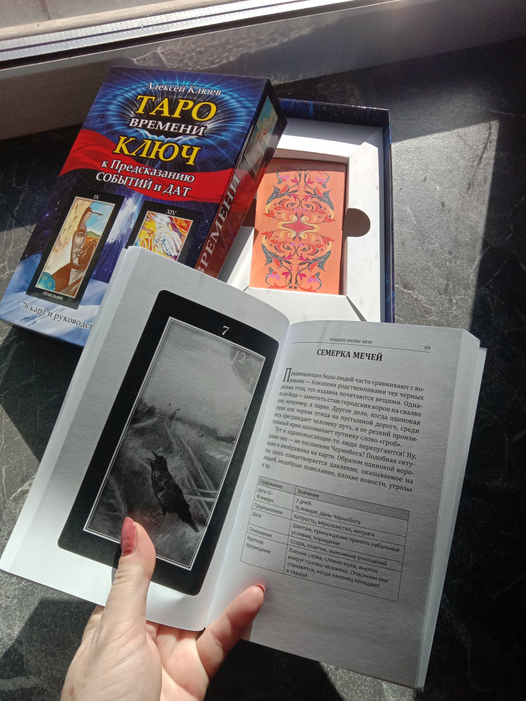 Сегодня наконец принесли мне эти прекрасные карты! Большая очень крепкая коробка. внутри книга, хорошего качества с объяснениями по датам., а так же сами карты Таро. Спасибо магазину!!!