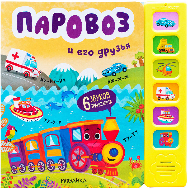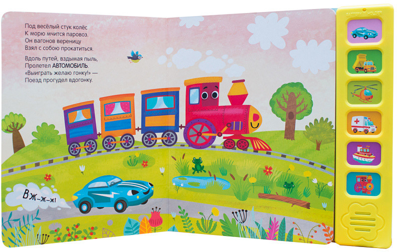 Ту-ту! Вж-ж-ж! Дети обожают звуковые книги — ведь так интересно нажимать на кнопки и слушать разные звуки. Книга «Паровоз и его друзья» из серии «Звуковые книги» с красочными иллюстрациями Анны Гузь и добрыми забавными стихами расскажет о приключениях паровозика, который мчится к морю. В пути вместе с веселым паровозом малыш повстречает его друзей: гоночную машину, пароход, машину скорой помощи, самосвал и вертолет. В книге 6 звуковых кнопок, нажимая на которые, ребенок услышит гудок парохода, сирену машины скорой помощи и другие звуки транспорта. Звук можно выключить повторным нажатием на кнопку.  |