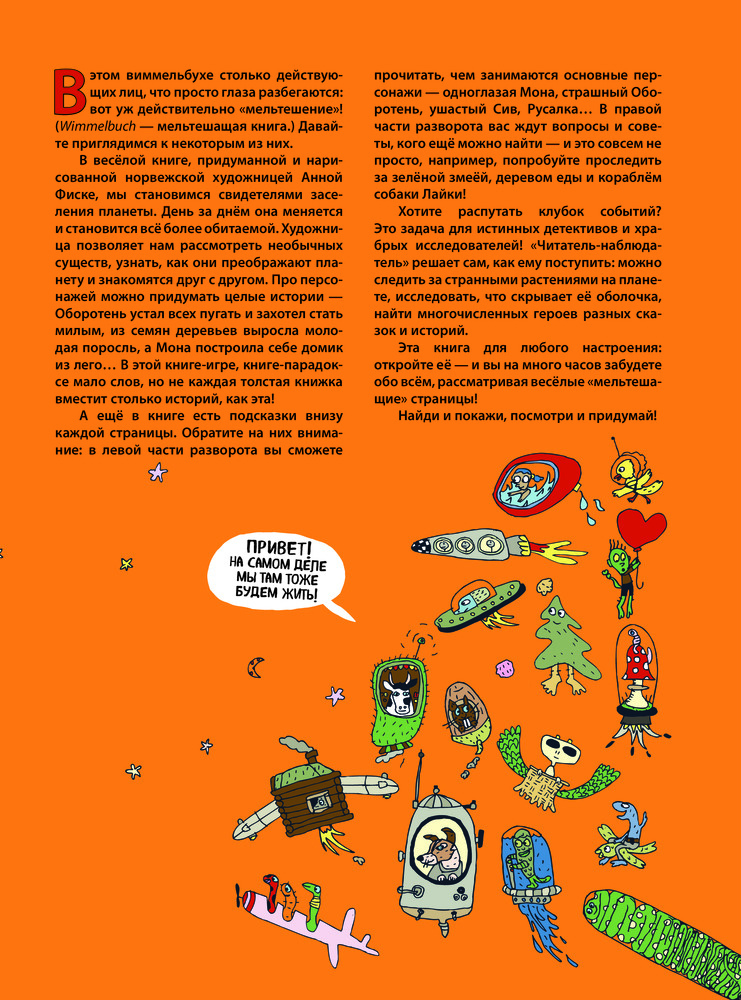 💳 Оплатить за товар можно при получении 🇰🇿 Есть бесплатная доставка по Казахстану 🎁 Копите бонусы с каждой покупки Вместе с норвежской художницей Анной Фиске мы станем свидетелями заселения фантастической планеты. Хотите стать истинным следопытом и детективом? Тогда распутайте клубок событий: как космическая Зеленая змея опутывает планету, Оборотень устал всех пугать и захотел стать милым, из семян деревьев выросла молодая поросль, а Мона построила себе домик из лего. В книге-игре, книге-парадоксе мало слов, но не каждая толстая книжка вместит столько историй, как эта! Эта книга — виммельбух подходит для любого настроения: откройте её — и вы на много часов забудете обо всём, рассматривая весёлые «мельтешащие» страницы! |