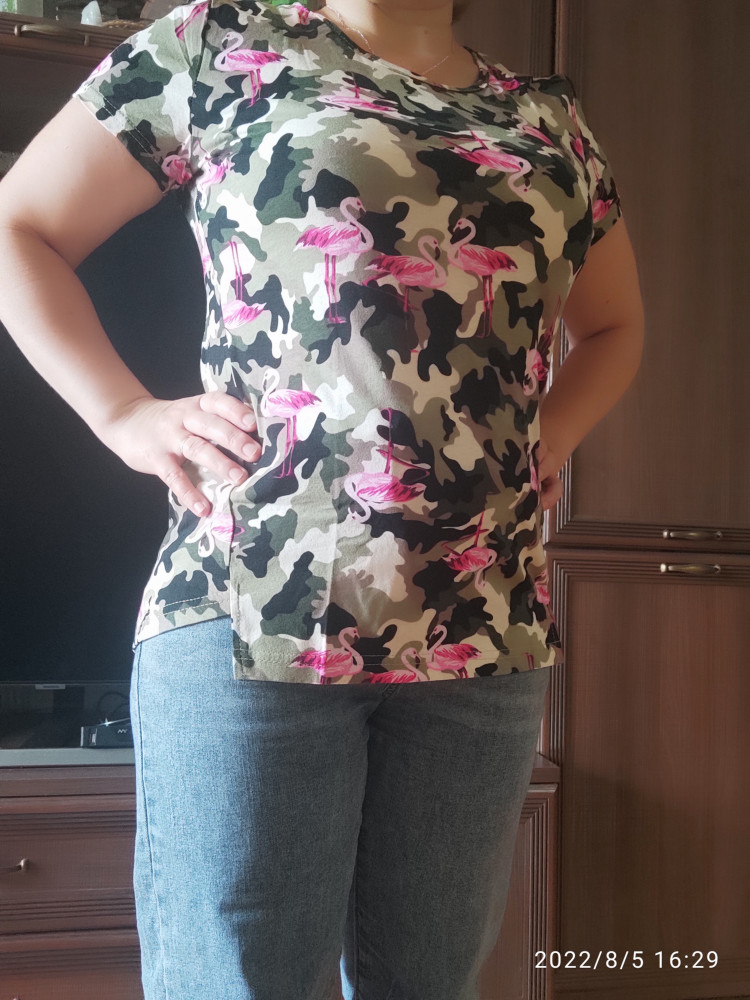 Футболка хорошего качества, красивой расцветки. Размер соответствует, но на полную грудь маловата, всё же надо брать на размер больше.