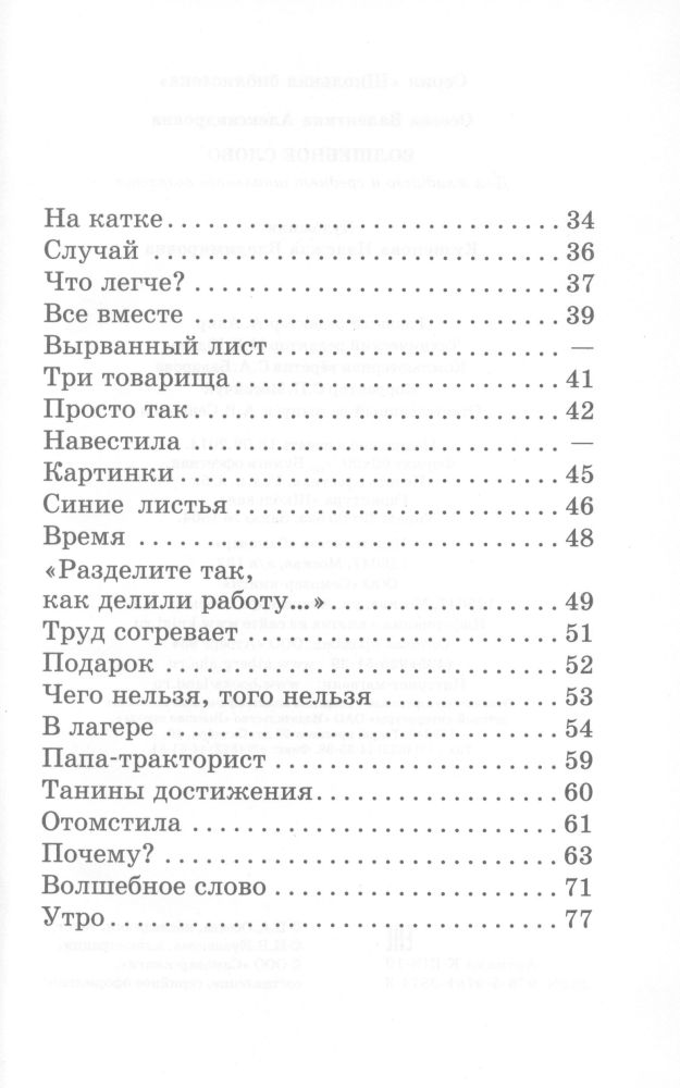 Книга сама хорошего качества как и все книги этой серии. Волшебное слово и другие рассказы довольно интересные поучительные как раз для детей. Все пришли целые как будто с витрины магазина аккуратно завернуты в бумагу. Спасибо 🌺 сборщику и поставщику.