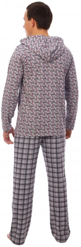 Костюм из мягкого трикотажа. Приятный к телу. Немного странно на мой взгляд, сочетается клетка на штанах и буквенный узор на кофте. Но в целом отлично сидит.