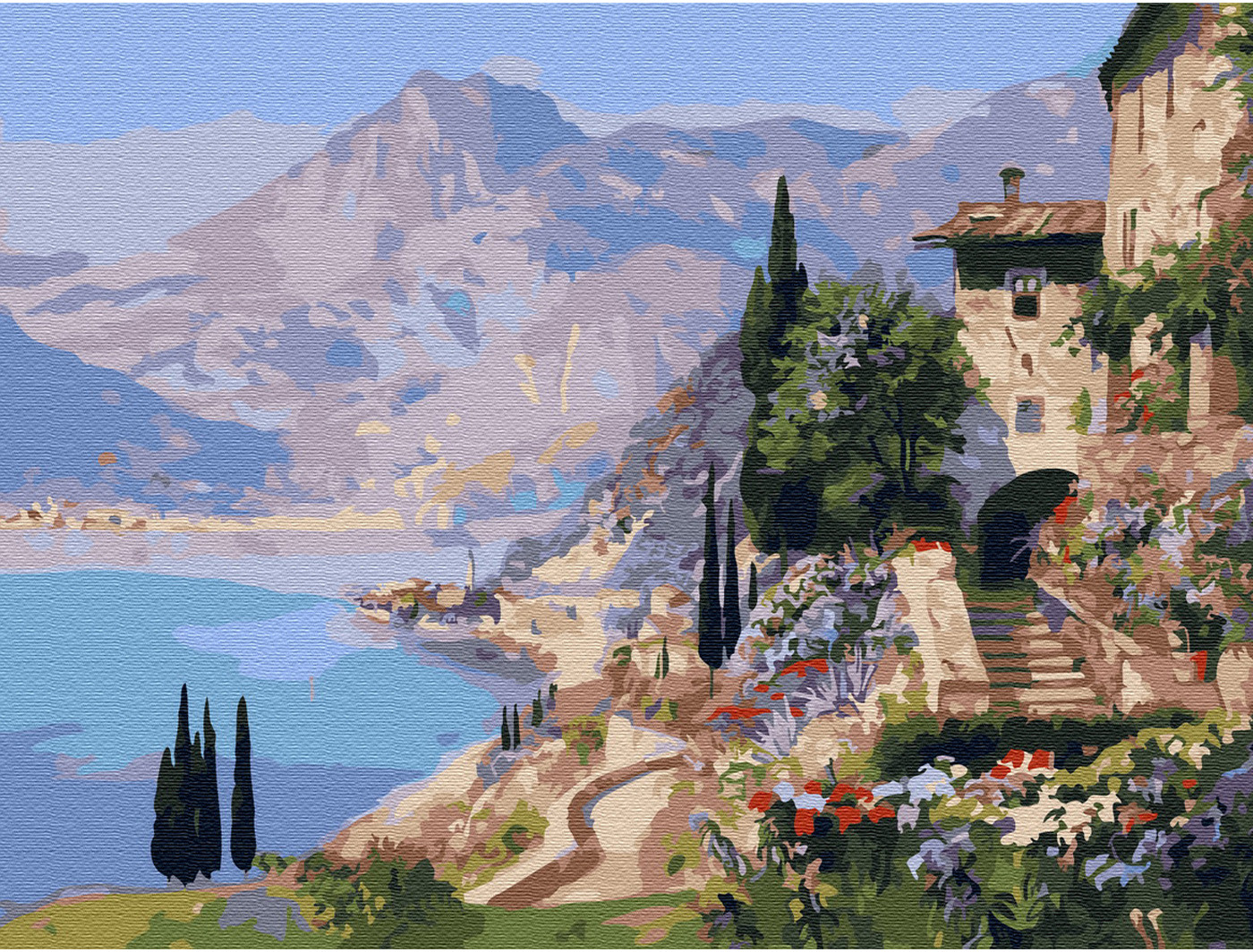 На картине по номерам Озеро Комо. Италия запечатлено третье по величине озеро Италии, красоты которого можно увидеть в картинах «Двенадцать друзей Оушена», «Казино рояль», «Месяц у озера».