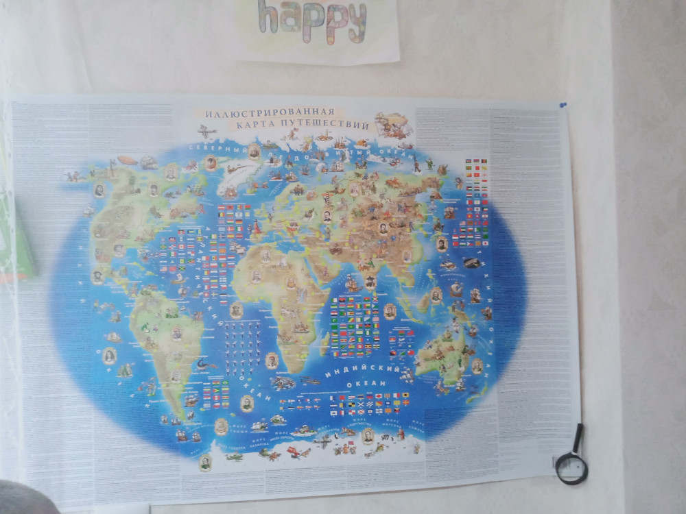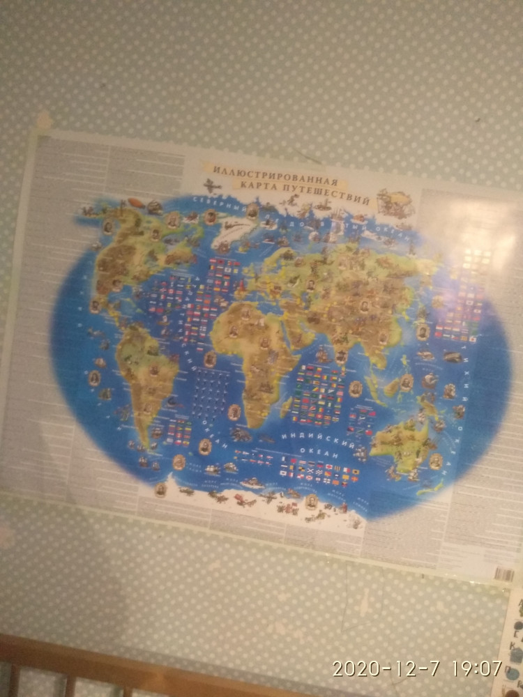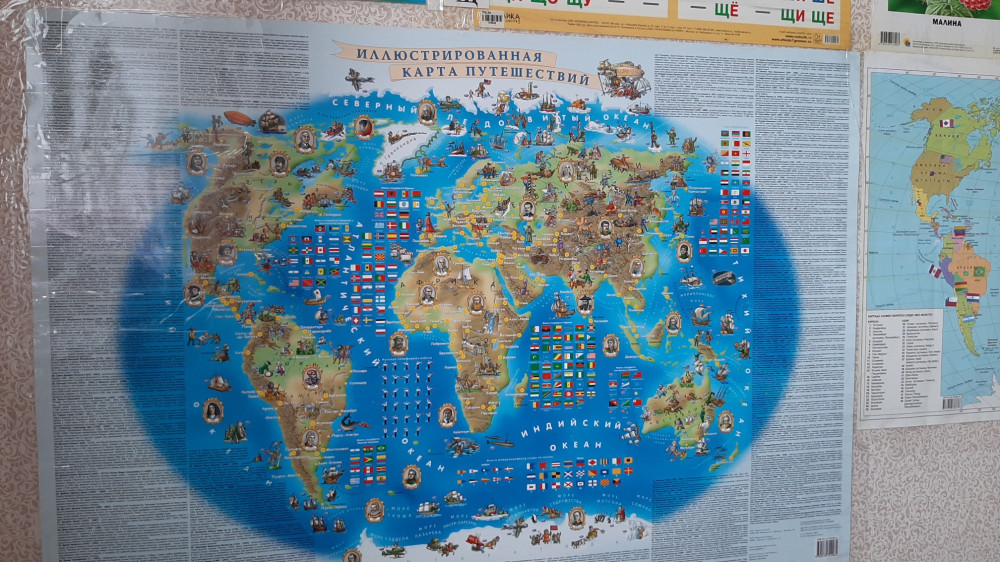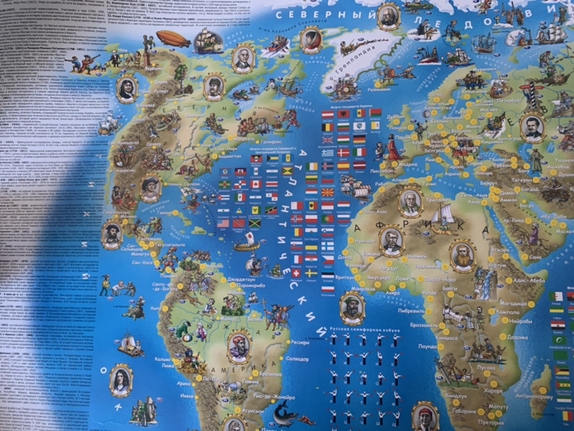 Замечательная карта, теперь изучаем историю путешественников, многое что и не знали, плюс есть азбука морская, нарисован алфавит с флажками, сама карта на очень плотной бумаге, что порадовало, спасибо. Минус только мелковатый шрифт, но для этого можно было ещё больше размером карту взять