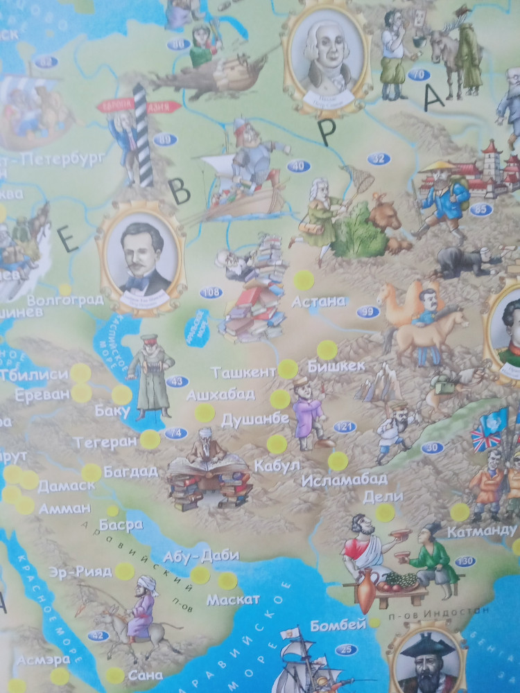 Карта супер. Цена смешная. На карте отмечены путешествия, даты, есть портреты путешественников. Слева и справа в столбиках описаны путешествия. Детям и взрослым очень интересно.