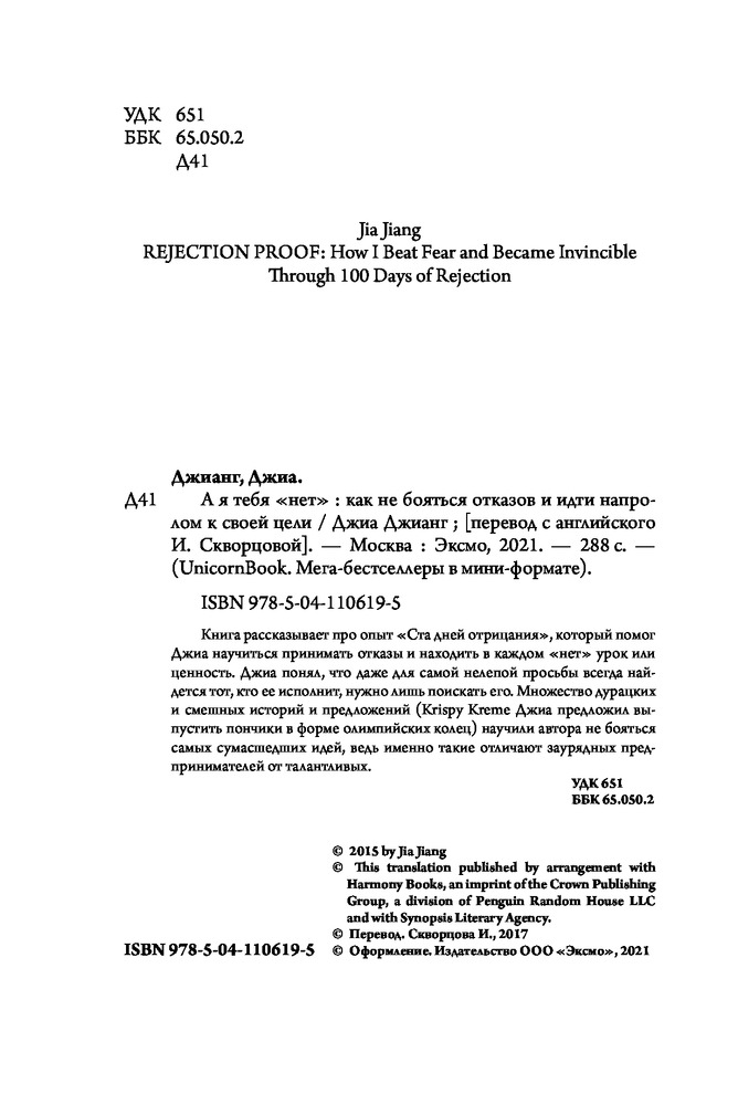 💳 Оплатить за товар можно при получении 🇰🇿 Есть бесплатная доставка по Казахстану от 1 дня 🎁 Копите бонусы с каждой покупки Серия: UnicornBook. Мега-бестселлеры в мини-формате Книга рассказывает про опыт «Ста дней отрицания», который помог Джиа научиться принимать отказы и находить в каждом «нет» урок или ценность. Джиа понял, что даже для самой нелепой просьбы всегда найдется тот, кто ее исполнит, нужно лишь поискать его. Множество дурацких и смешных историй и предложений (Krispy Kreme Джиа предложил выпустить пончики в форме олимпийских колец) научили автора не бояться самых сумасшедших идей, ведь именно такие отличают заурядных предпринимателей от талантливых. |