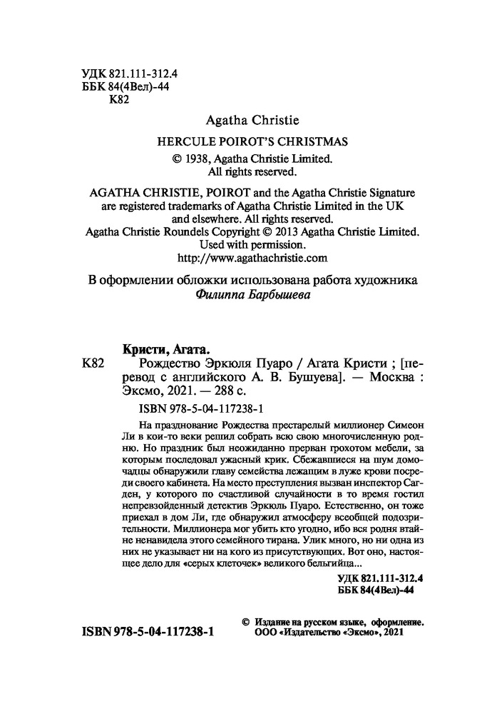 Рождество Эркюля Пуароинтересный сюжет неожиданный финал хорошее качество В данный момент этот товар отсутствует в продаже. Возможно, у нас найдется аналогичный или похожий товар здесь. На празднование Рождества престарелый миллионер Симеон Ли в кои-то веки решил собрать всю свою многочисленную родню. Но праздник был неожиданно прерван грохотом мебели, за которым последовал ужасный крик. Сбежавшиеся на шум домочадцы обнаружили главу семейства, лежащим в луже крови посреди своего кабинета. На место преступления вызван инспектор Сагден, у которого по счастливой случайности в то время гостил непревзойденный детектив Эркюль Пуаро. Естественно, он тоже приехал в дом Ли, где обнаружил атмосферу всеобщей подозрительности. Миллионера мог убить кто угодно — ибо вся родня втайне ненавидела этого семейного тирана. Улик много, но ни одна из них не указывает ни на кого из присутствующих. Вот оно, настоящее дело для «серых клеточек» великого бельгийца... |