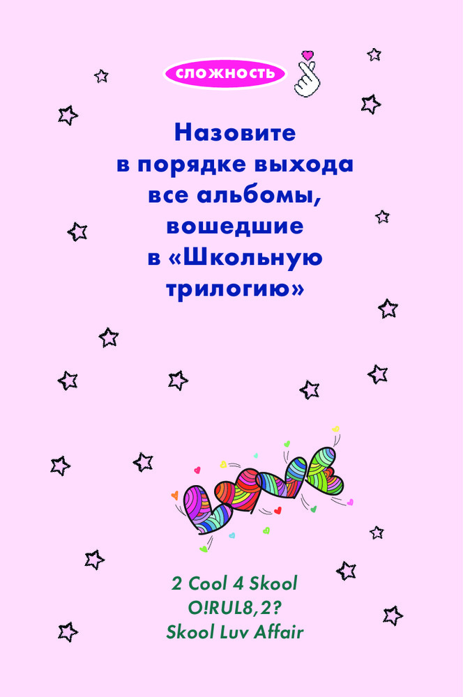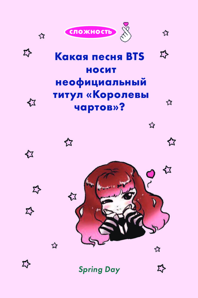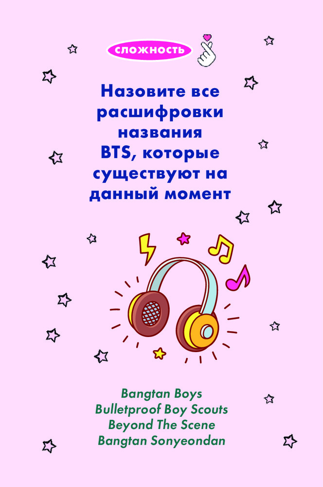 Серия: K-POP. Главные книги о корейской культуре Как узнать, кто же в вашей компании самый главный фан BTS? Динамичный квиз, посвященный популярной K-POP группе, как раз то, что нужно. Вам понадобится: от 2 до 15 друзей, свободный вечер, эта настольная игра и запас веселья. Перетасуйте карточки и вытаскивайте их по очереди из колоды. На карточках — разные вопросы об участниках BTS, но есть еще специальные карточки-действия, которые станут для вас сюрпризом. Если игроков много, можно играть команда на команду. Или, например, выбрать ведущего: пусть он руководит игрой, задает вопросы и начисляет очки. А, может, вы решите сразиться один на один? Вариантов много, выберите тот, который вам нравится больше всего, и погрузитесь во вселенную BTS! |