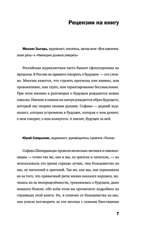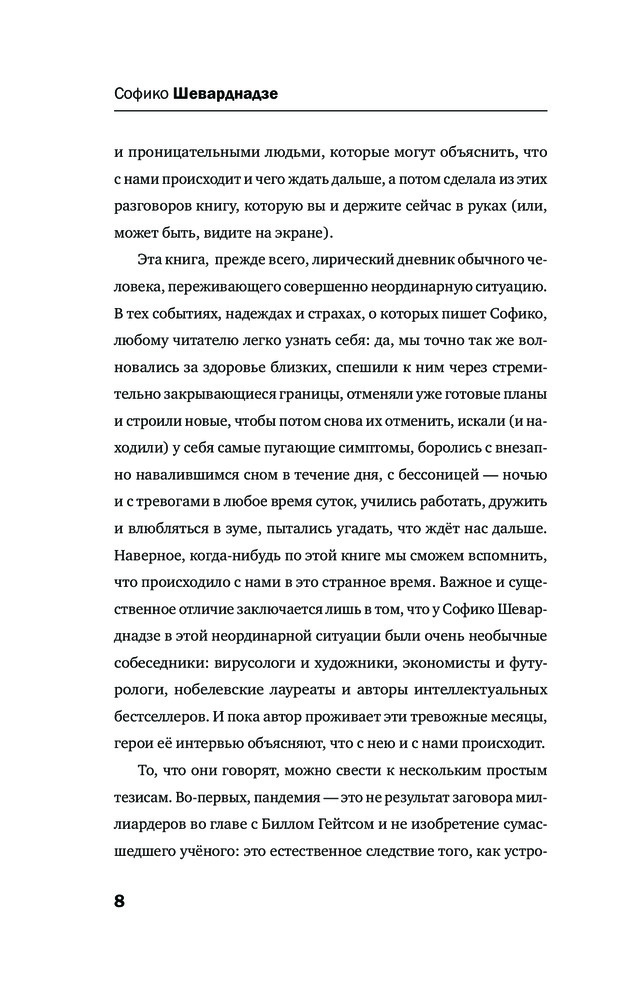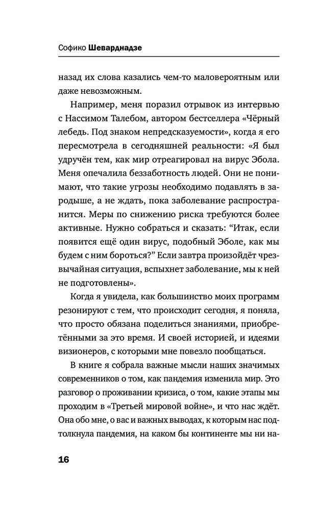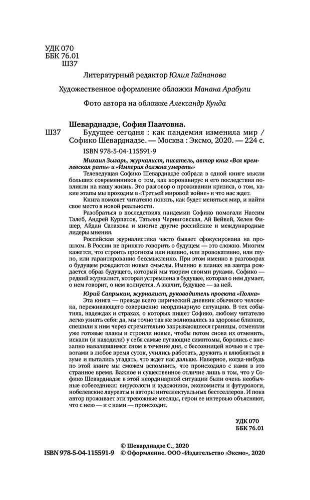 Будущее сегодня. Как пандемия изменила мирВ данный момент этот товар отсутствует в продаже. Возможно, у нас найдется аналогичный или похожий товар здесь. Серия: Софико Шеварднадзе. Беседы о будущем Телеведущая Софико Шеварднадзе собрала в одной книге мысли больших современников о том, как коронавирус и его последствия повлияли на нашу жизнь. Это разговор о проживании кризиса, о том, какие этапы мы проходим в «Третьей мировой войне» и что нас ждет. |