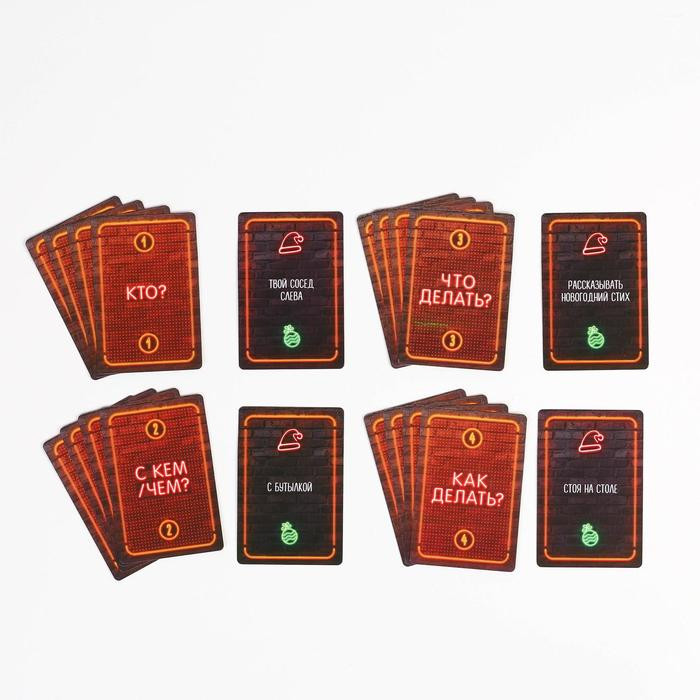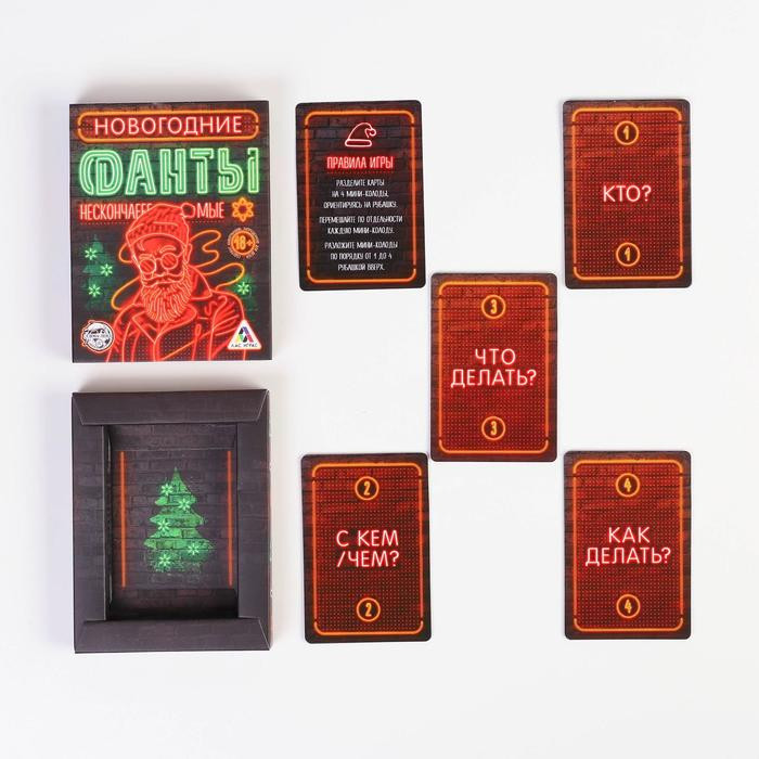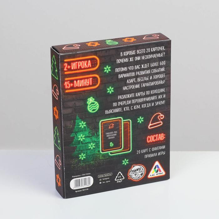Фанты, которые не кончаются. В коробке всего 20 карточек, почему же они нескончаемые? Потому что вас ждёт более 600 вариантов развития событий. Азарт, веселье и хорошее настроение гарантированы! Разложите карты по колодам, по очереди переворачивайте их и выясняйте, кто, с кем, когда и зачем.