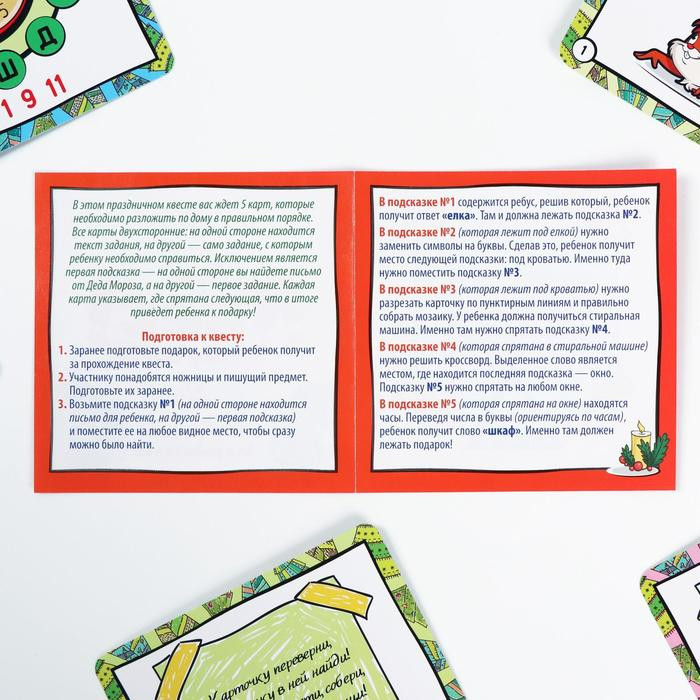 Что нужно делать? Купите подарок и спрячьте его там, где будет проходить мероприятие. Разложите карточки с заданиями в указанном порядке. Участника ждут шифры, вырезалки, лабиринты и другие интересные задачи. Положите письмо от Деда Мороза на видное место — с него начнётся квест. Увлекательное приключение для ребёнка обеспечено!