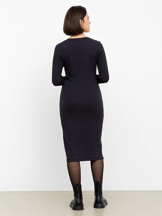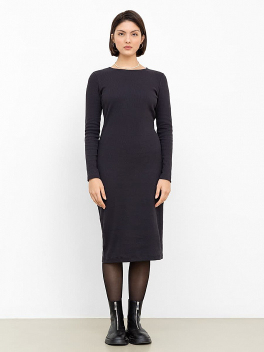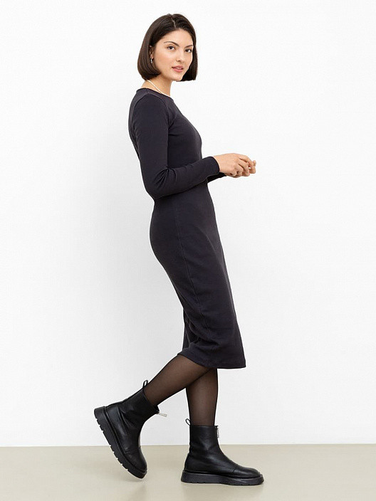 Повседневное платье с длинным рукавом в темно-сером цвете прилегающего кроя. Платье выполнено из 95% хлопка и 5% эластана. Модель имеет круглый вырез горловины. Фасон платья выгодно подчеркнет Вашу фигуру. Платье можно сочетать с полусапожками с добавлением акцента в виде ремня. Модель также отлично подойдет для офиса в прохладную погоду.