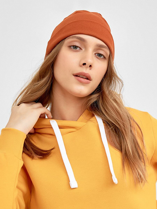 Цвет Миндаль как на фото, такой кирпичный, размер 58 на взрослую голову не подошел, ткань довольно плотная, дочери 12 лет нормально.