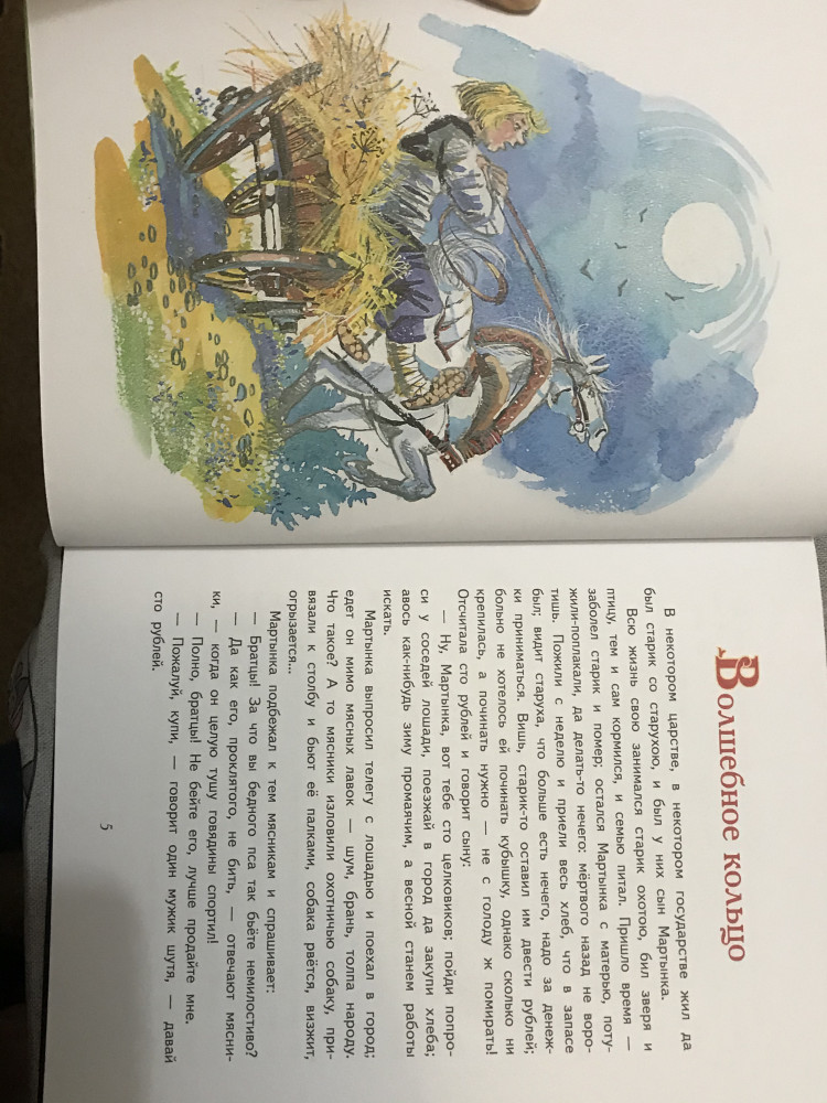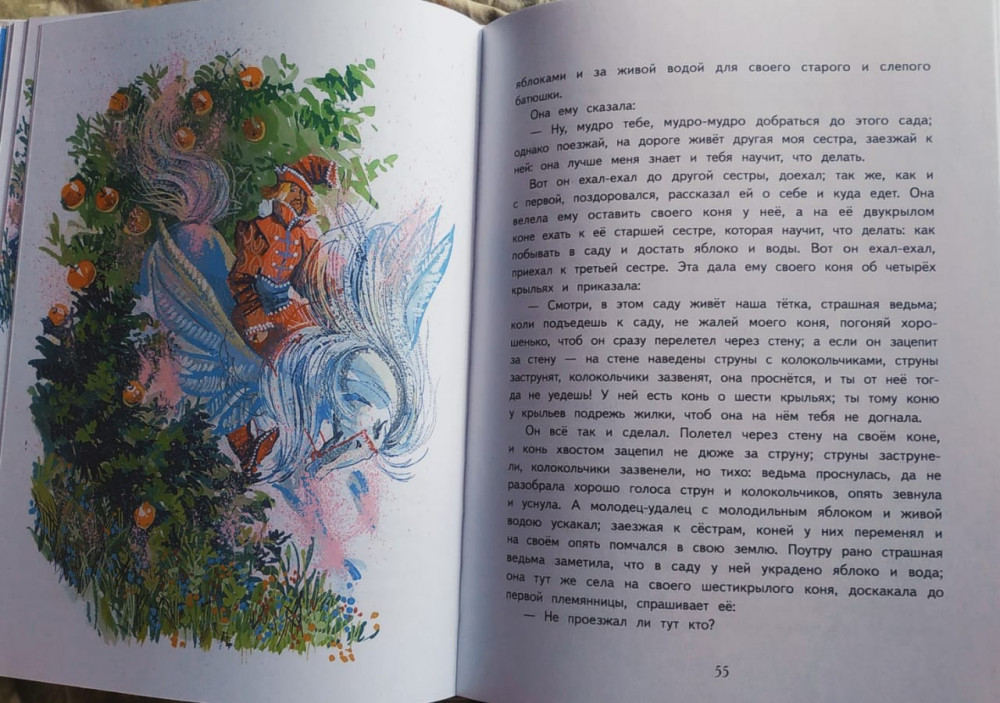 Книжка издана очень хорошо. Переплёт очень прочный и красивый, страницы белые, шрифт хороший. Рисунки цветные, красивые, есть большие и среднего размера. В книге 9 сказок: 1.Волшебное кольцо; 2.Летучий корабль; 3.Сказка о молодце-удальце, моодильных яблоках и живой воде; 4.Три царства - медное, серебряное и золотое; 5.Хрустальная гора; 6.Сказка о серебряном блюдечке и наливном яблочке; 7.Окаменелое царство; 8.Во лбу солнце, на затылке месяц, по бокам звёзды; 9.Марья Моревна. Книжка очень хорошая. Только хотелось бы, ещё больше рисунков. Хотя не могу сказать, что рисунков совсем мало. Их не мало.