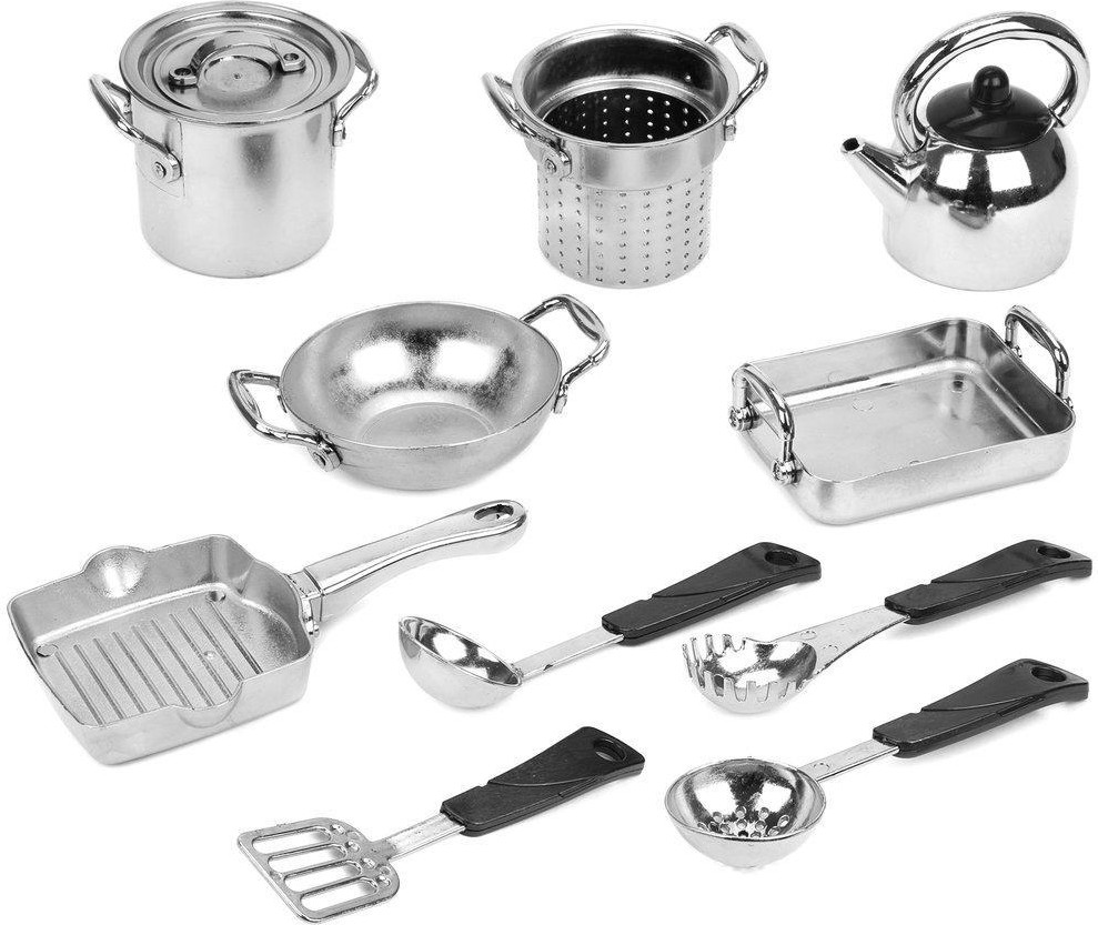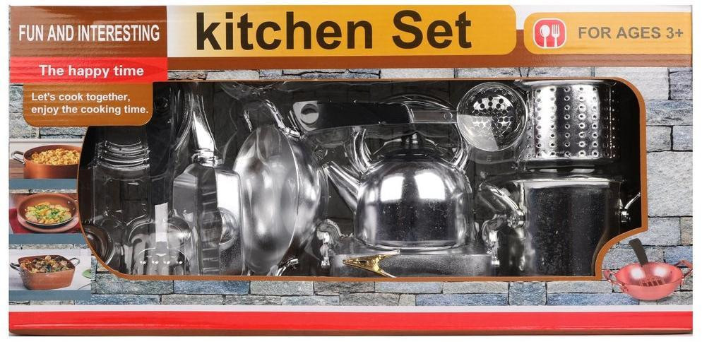 В комплект входит 11 реалистично выполненных предметов: 1 сковородка, 1 жаровня, 1 крышка, 1 кастрюля, 2 дуршлага, 1 чайник, 1 поднос, 1 шумовка, 1 лапшеловка и 1 половник. Игрушки выполнены в серебристой расцветке.